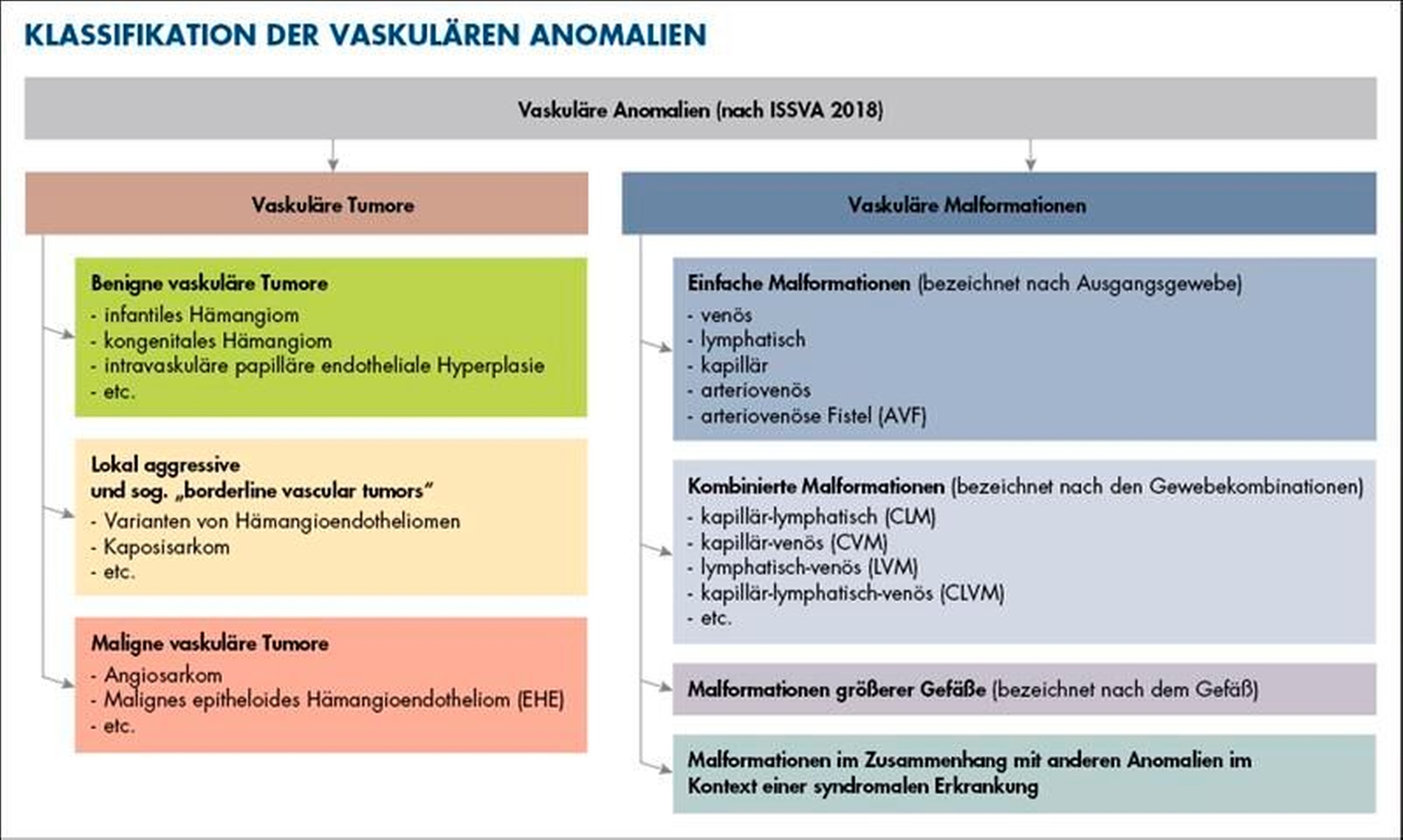 Vaskuläre Anomalien werden gemäß der Klassifikation der „International Society for the study of vascular anomalies“ (ISSVA) eingeteilt in vaskuläre Tumore und vaskuläre Malformationen. Dabei sind Hämangiome als benigne vaskuläre Tumore klassifiziert, die nur im Kindesalter auftreten. Diese sind klar abzugrenzen von anderen vaskulären Anomalien, allen voran von den vaskulären Malformationen, die nicht als vaskuläre Tumore gelten und im Gegensatz zu Hämangiomen nicht die Potenz haben, sich selbst zurückzubilden. Eine vereinfachte Version der Klassifikation sehen Sie in der Grafik (Abbildung 7).