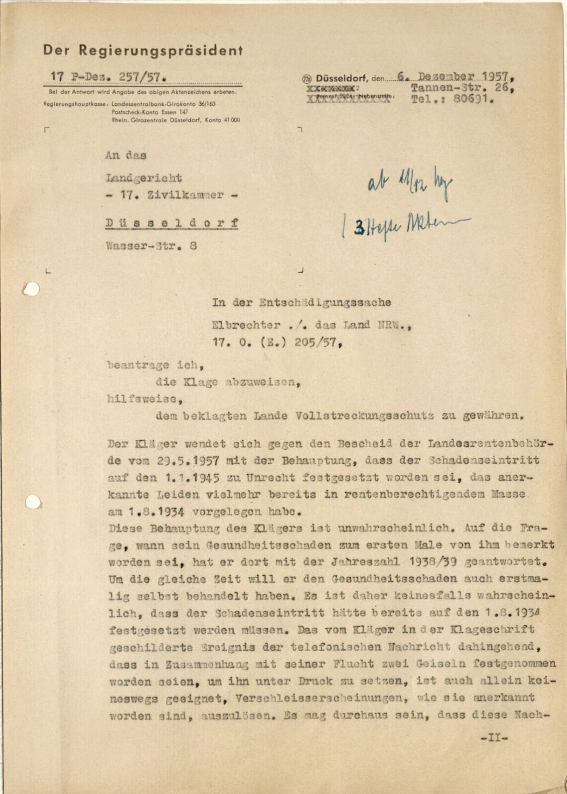 Am 29. Mai 1957 sprach ihm die Landesrentenbehörde auf der Grundlage einer „verfolgungsbedingten Erwerbsminderung“ rückwirkend eine „Beschädigtenrente“ ab dem 1. Januar 1945 zu [LA NRW, BR 2182, Nr. 5029]. Doch gegen diese Entscheidung erhob Elbrechter am 15. August 1957 Klage: Er stellte den Antrag, „das Land Nordrhein-Westfalen zu verurteilen, an mich eine Kapitalentschädigung zur Beschädigtenrente nicht erst ab 1.1.45, sondern ab 1. Aug. 1934 zu zahlen“. Zur Begründung gab er an, dass sein „Gesundheitsschaden“ viel früher aufgetreten sei: „Es war Ende Juli 34, anlässlich eines abendlichen Telefongesprächs in Amsterdam im Hotel Carlton, als ich die telefonische Nachricht erhielt, dass wegen meiner Flucht anlässlich der Ermordungen des 30. Juni 34 zwei Geiseln festgenommen wurden, um mich unter Druck zu setzen, nach Deutschland zurückzukehren.“ Er habe einen „derartigen Schock“ erlitten, „dass ich zum ersten Mal, wie der Laie sagt, am Telefon ‚weiche Knie‘ bekam und ich mich nur mit Mühe aufrecht erhalten konnte. Von dieser Zeit an litt ich jahrelang unter sehr starken Kopfschmerzen, Schwindel und stärkster Schlaflosigkeit. Die damals eingetretene Erniedrigung des Blutdruckes besteht praktisch jetzt noch“ [LA NRW, BR 2182, Nr. 5029].