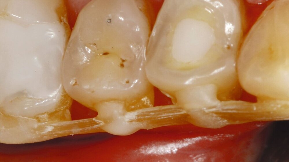 Es gibt viele Möglichkeiten, permanente Schienungen von Zähnen mit Komposit alleine oder in Kombination mit Glasfasern durchzuführen. Die Verblockung der Approximalräume benachbarter karies- und füllungsfreier Zähne mit Komposit stellt eine ästhetisch akzeptable Schienung dar und kann so vorgenommen werden, dass die parodontale Reinigungsfähigkeit erhalten bleibt (Abbildung 5). Als Nachteil dieser rigiden Schienungsform sind mögliche Schienungsfrakturen zu nennen, die insbesondere bei höheren Mobilitätsgraden vorkommen. Glasfaser-Komposit-Schienungen weisen ebenfalls eine hohe Rigidität auf. Sie können zahnhartsubstanzschonend an den oralen Flächen der Zähne angebracht werden. Alternativ kann bei gut ausgeformten Zahnbögen im Frontzahngebiet eine inzisale Schienung vorgenommen werden. Dafür ist zumeist eine Präparation erforderlich, um Platz für das Schienungsmaterial zu schaffen. Bei approximalen Füllungen oder bei Karies an angrenzenden Flächen benachbarter Zähne können auch zwei Approximalfüllungen miteinander verbunden werden, um eine Schienung durchzuführen.