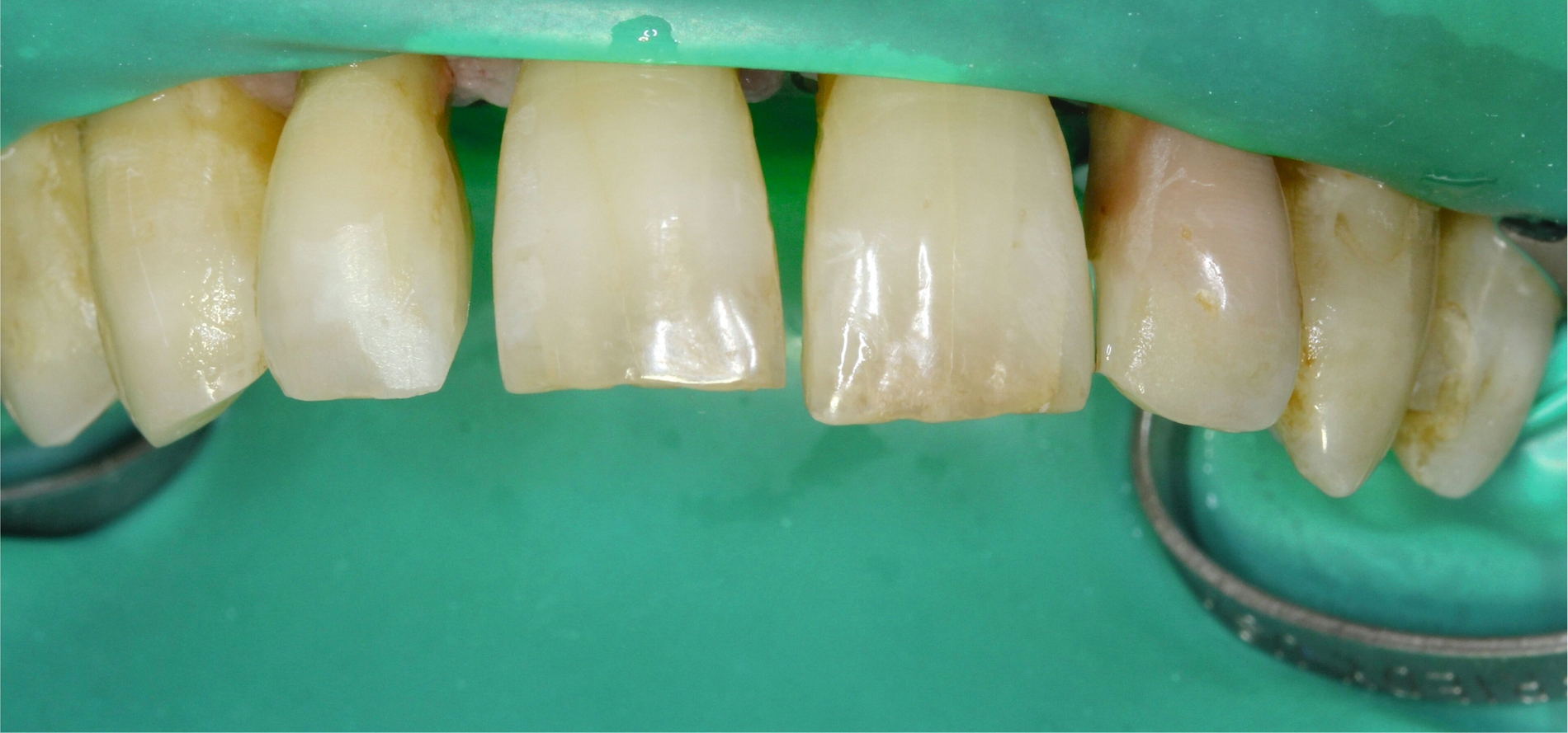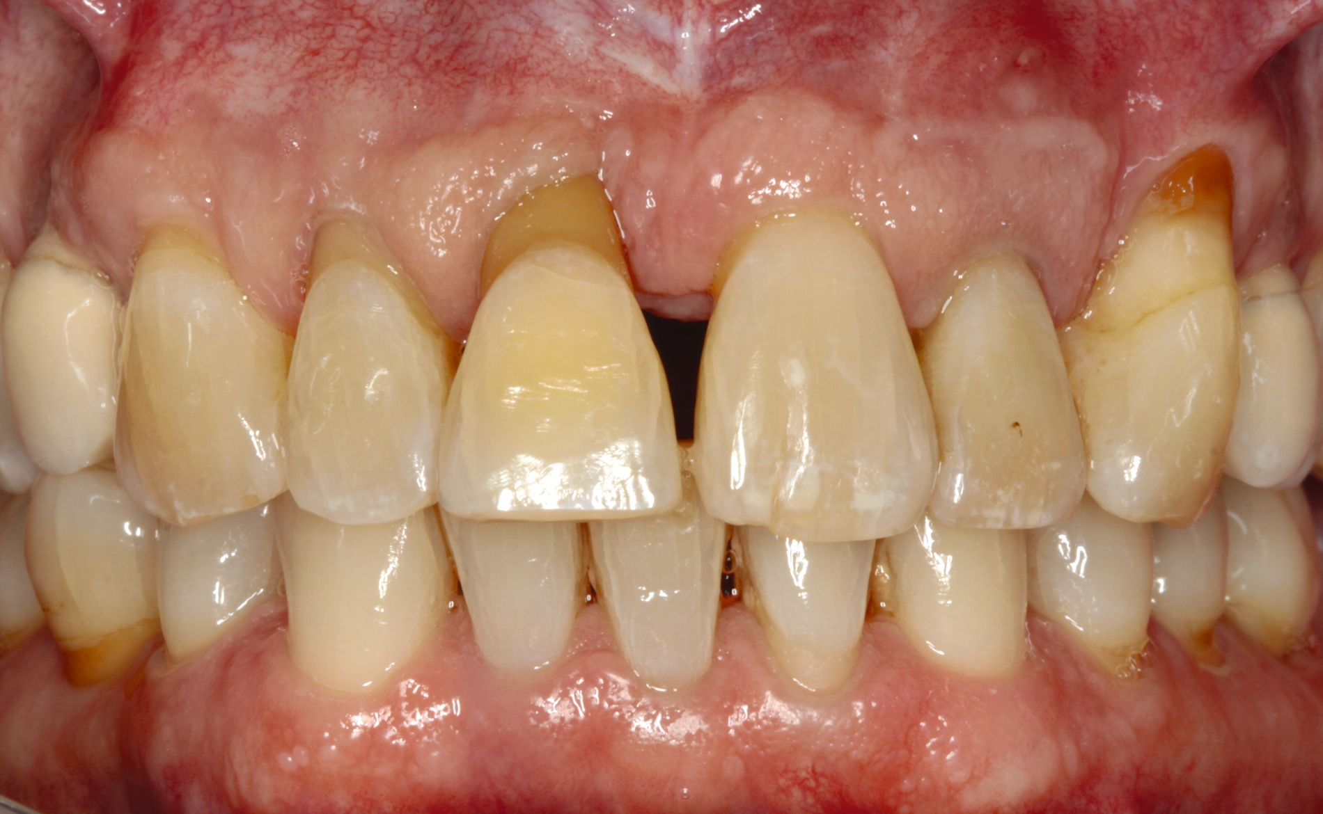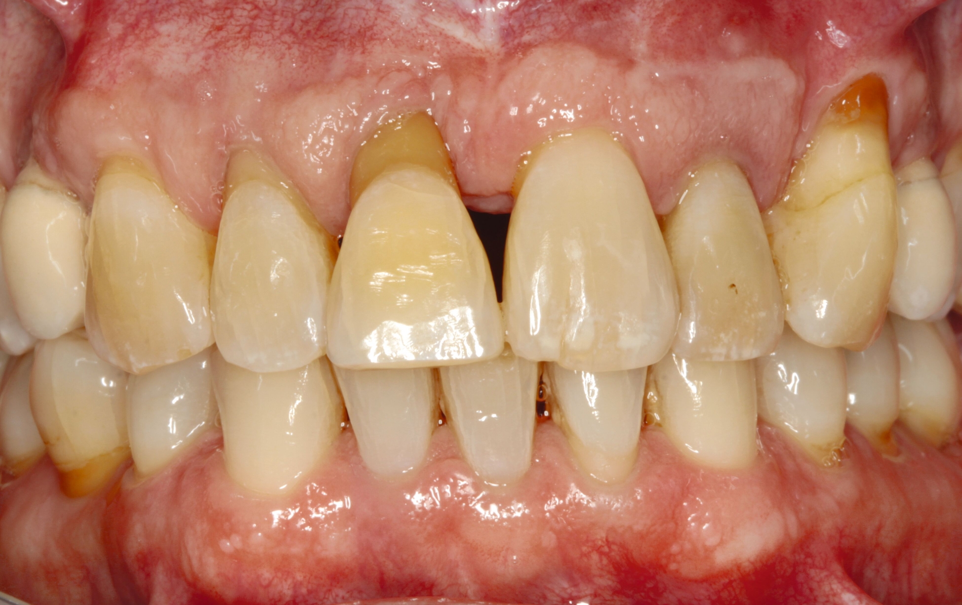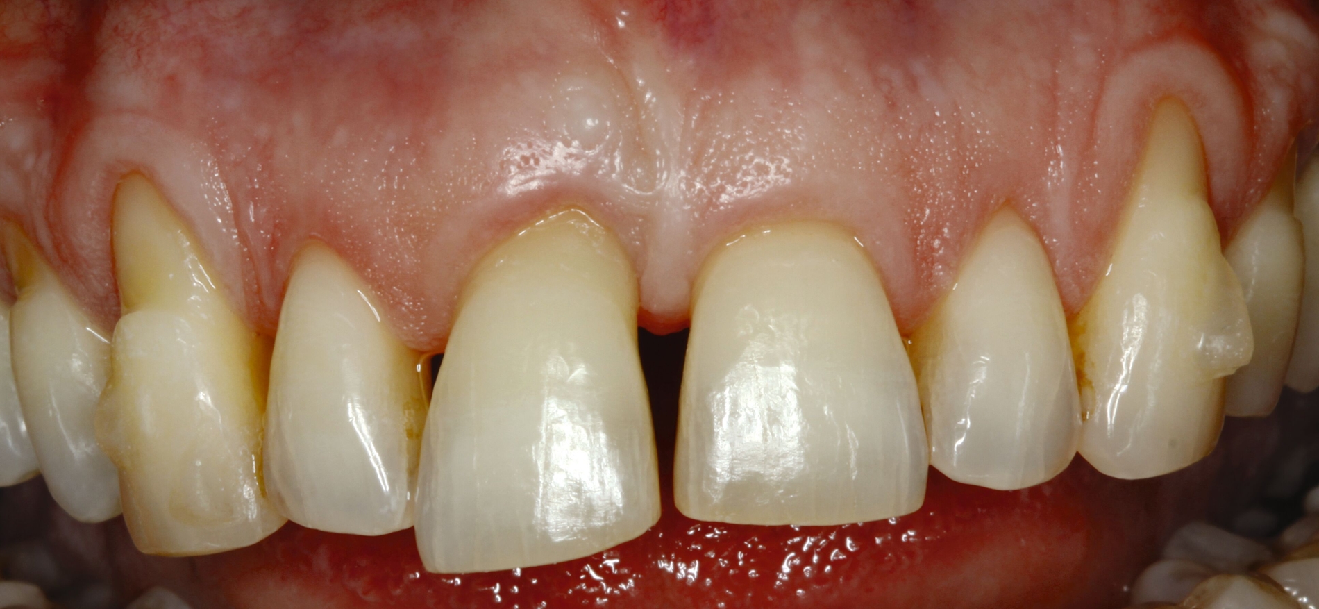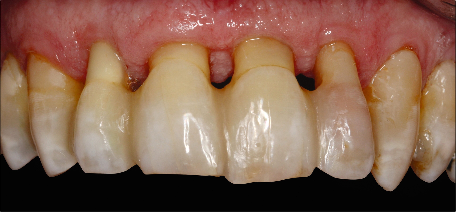 Eine weitere Möglichkeit der permanenten Schienung besteht in der vertikalen Verlängerung des Kontaktpunktes von Zähnen durch hochwertiges Kompositmaterial im Rahmen von Frontzahnverbreiterungen zur Reduktion der „schwarzen Dreiecke“ (Abbildung 6). Diese Schienungsform erhält die physiologische Eigenbeweglichkeit der Zähne und die parodontale Reinigungsfähigkeit.