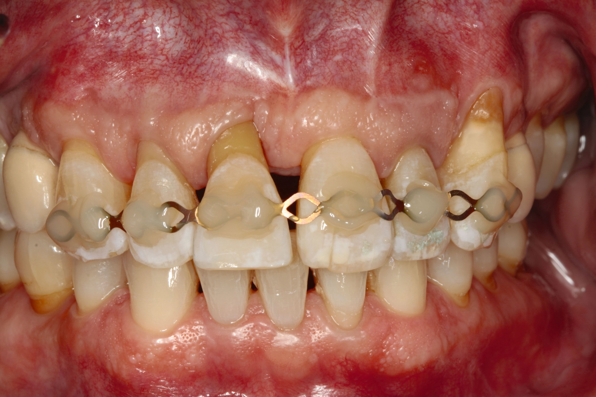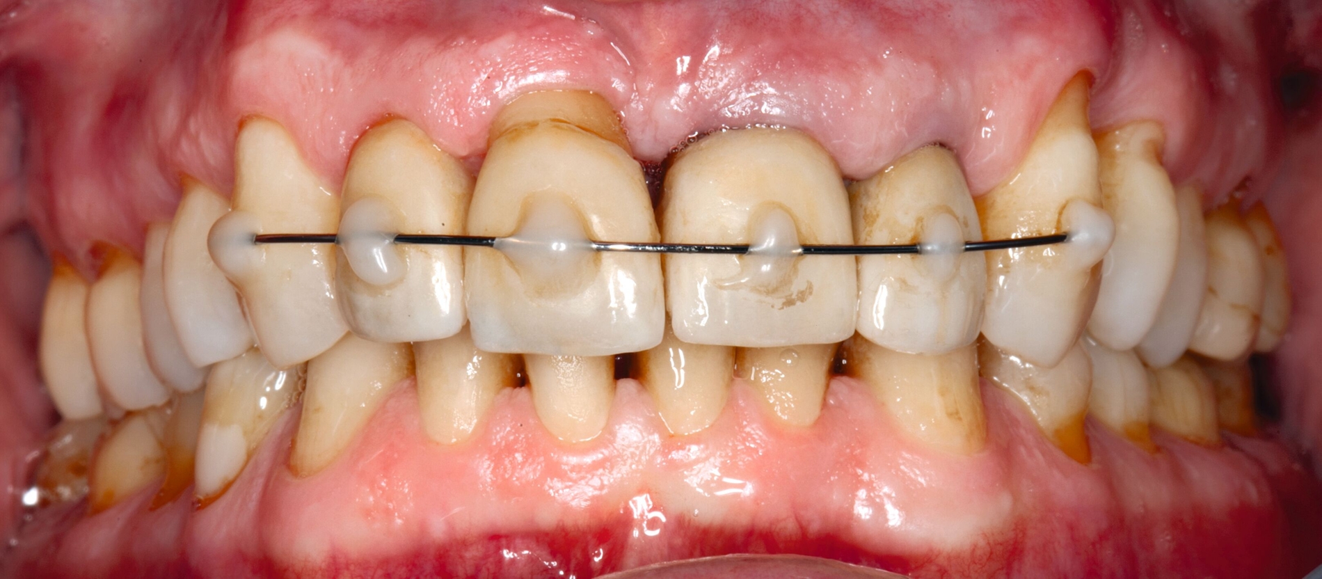 Möglichkeiten zur Therapie des okklusalen Traumas sind das selektive Einschleifen okklusaler Frühkontakte, die Schienung der betroffenen Zähne oder gegebenenfalls auch kieferorthopädische Bewegungen der Zähne sowie eine Kombination der genannten Therapieformen [Fan und Caton, 2018; Dommisch et al., 2022]. Ein Beispiel für eine Schienung bei Vorliegen einer okklusalen Dysfunktion ist in Abbildung 2 dargestellt.