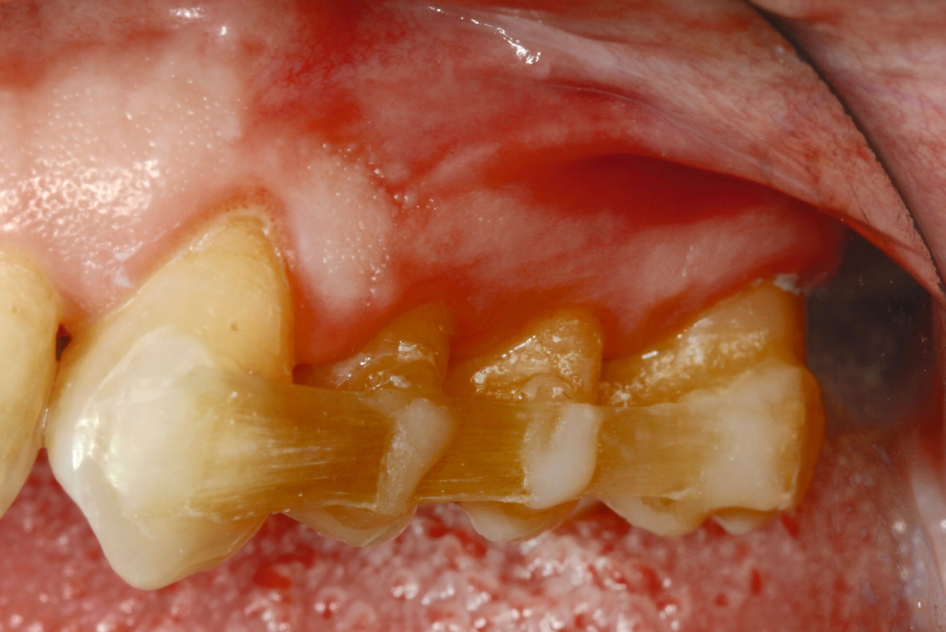 Entsprechend der hier aufgeführten schwachen wissenschaftlichen Evidenz lässt sich schlussfolgern, dass Zähne mit einem Lockerungsgrad II oder höher möglicherweise von einer Schienung vor regenerativen parodontalchirurgischen Eingriffen profitieren können [Cortellini et al., 2001]. Diskutiert wird in diesem Zusammenhang die Förderung der Stabilität des Blutkoagulums durch die Reduktion der Mobilität der Zähne in der Heilungszeit. Nicht zuletzt kann durch eine Schienung das aufgrund der Mobilität mögliche sekundäre okklusale Trauma reduziert beziehungsweise eliminiert werden. In diese Schienungen wird in der Regel jeweils ein benachbarter Zahn ohne erhöhte Mobilität einbezogen. Zwei verschiedene Schienungen zur Reduktion der Mobilität im Rahmen der regenerativen Parodontalchirurgie sind in den Abbildungen 3 und 4 dargestellt.