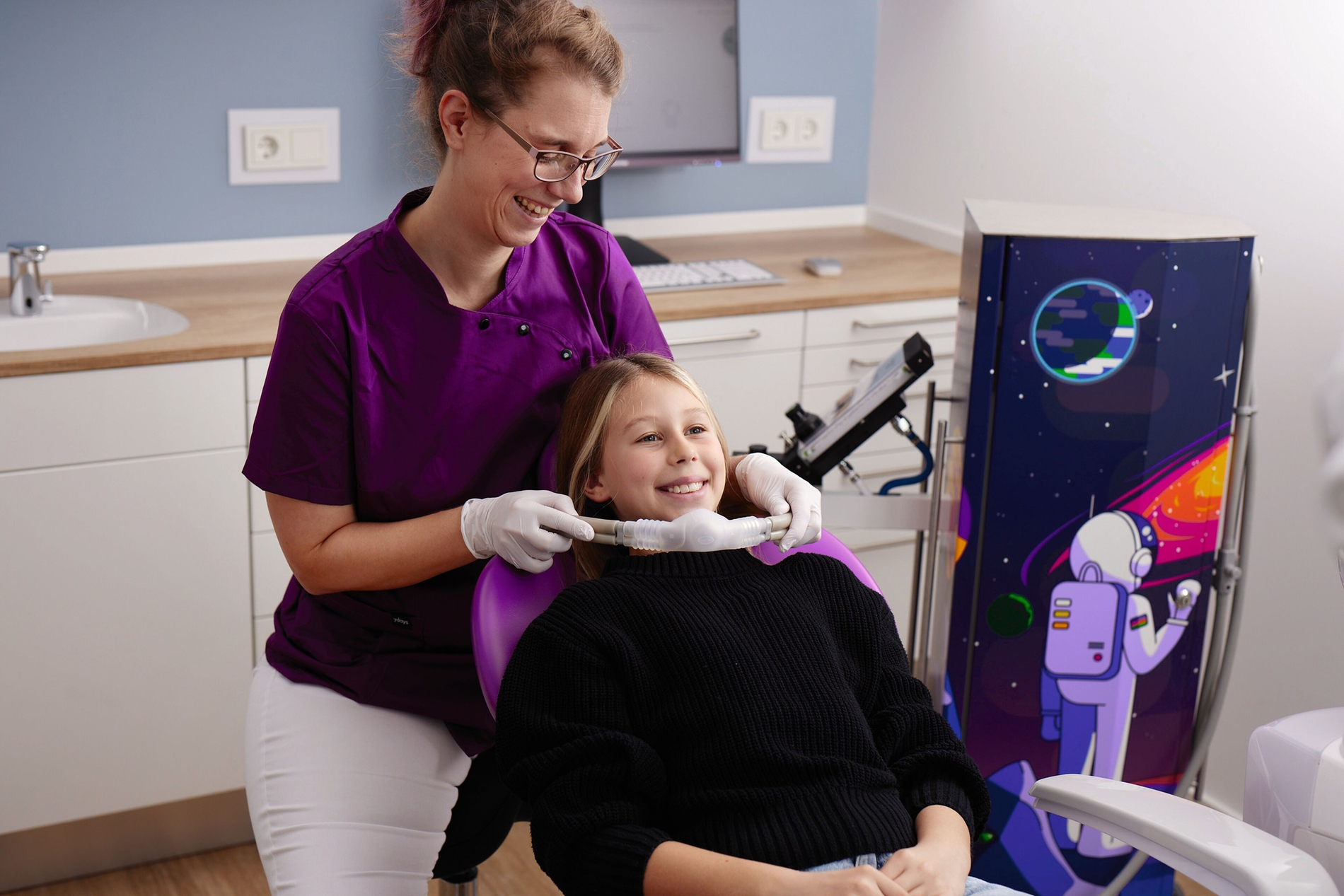 Das Highlight der Gründung ist die Kids-Untermarke. Die Marketing-Crew nahm Hahn („Ich habe privat ein großes Faible für Astrophysik!“) beim Wort und kreierte für die Kinderzahnarztpraxis ein Weltraumkonzept: Zwei kleine Kosmonauten begleiten den Praxisbesuch, die Kids sitzen auf einem Behandlungsstuhl im Weltraum-Look und auf der kindgerecht gestalteten Website erklären Weltraum-Analogien die Behandlungen. „Die Texte und kleinen Weltraum-Geschichten sind toll! Ich nutze sie ständig im Umgang mit den Kindern, um ihre Neugier zu wecken und ihnen zu erklären, was mit ihren Zähnen passiert“, erzählt Hahn begeistert.