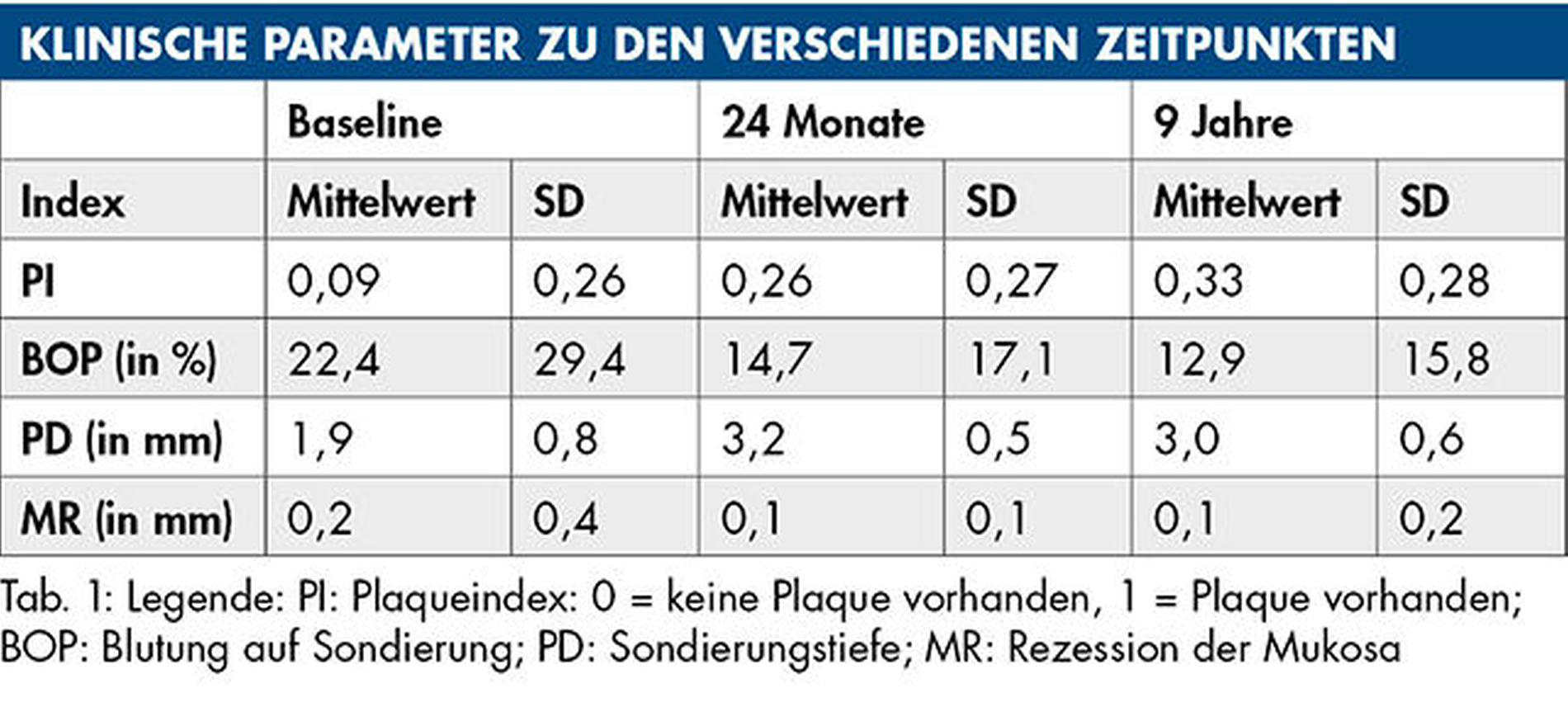 Von diesen 29 Implantaten wurde in zehn Fällen vor dem Zwei-Jahres-Recall eine periimplantäre Mukositis diagnostiziert, die mit mechanischer Reinigung und lokaler antiseptischer Therapie mit Chlorhexidindigluconat therapiert wurde. Bei weiteren zehn Implantaten trat ebenfalls vor dem Zwei-Jahres-Recall eine Periimplantitis auf, die mit einer Er:Yag Lasertherapie behandelt wurde. Nach neun Jahren bestand kein Unterschied bei Blutung auf Sondierung zwischen den vorher behandelten und den unbehandelten Implantaten. Die Mehrheit der Patienten (82,8 Prozent) zeigte keine Plaque um die Implantate zur Baselineuntersuchung, bei den beiden Recallterminen stieg der Plaqueindex jedoch signifikant an. Die übrigen Ergebnisse auf Implantatniveau sind in der Tabelle dargestellt.