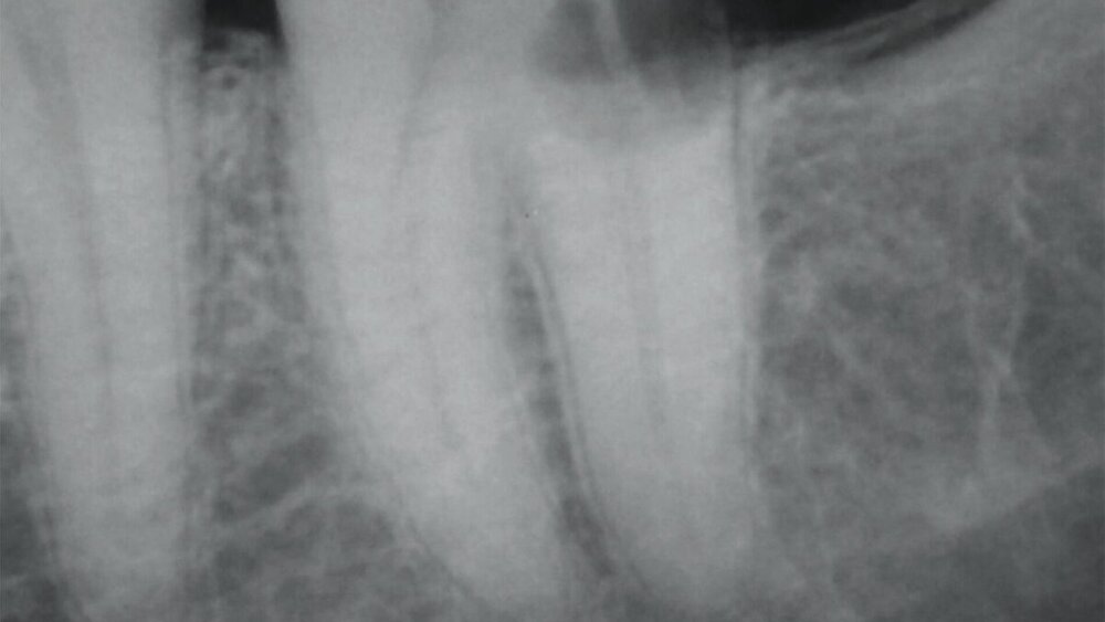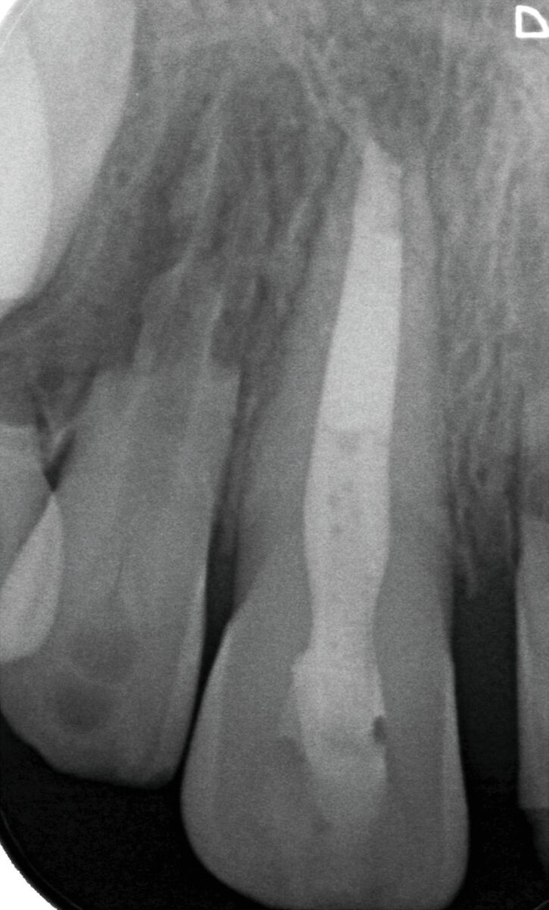Bei allen Varianten der progressiven internen Resorption ist grundsätzlich eine endodontische Intervention erforderlich. Nach Entfernung des resorbierenden Gewebes aus dem Wurzelkanal kann dieses sorgfältig desinfiziert und gefüllt werden (Abbildung 9). Wenn der Resorptionsdefekt die Wurzelkanalwand durchbrochen hat, sollten bioaktive hydraulische Kalziumsilikatzemente wie Mineral Trioxide Aggregate (MTA) zur Reparatur verwendet werden. Im Fall einer Perforation kann auch eine chirurgische Behandlung von außen erforderlich sein. Die Prognose für den betroffenen Zahn hängt von der Position, der Größe und dem Infektionsgrad des Defekts ab. Ist die Zahnerhaltung aufgrund eines erheblichen Substanz- und Stabilitätsverlusts nicht mehr möglich, ist eine Extraktion unumgänglich [Nilsson et al., 2013].