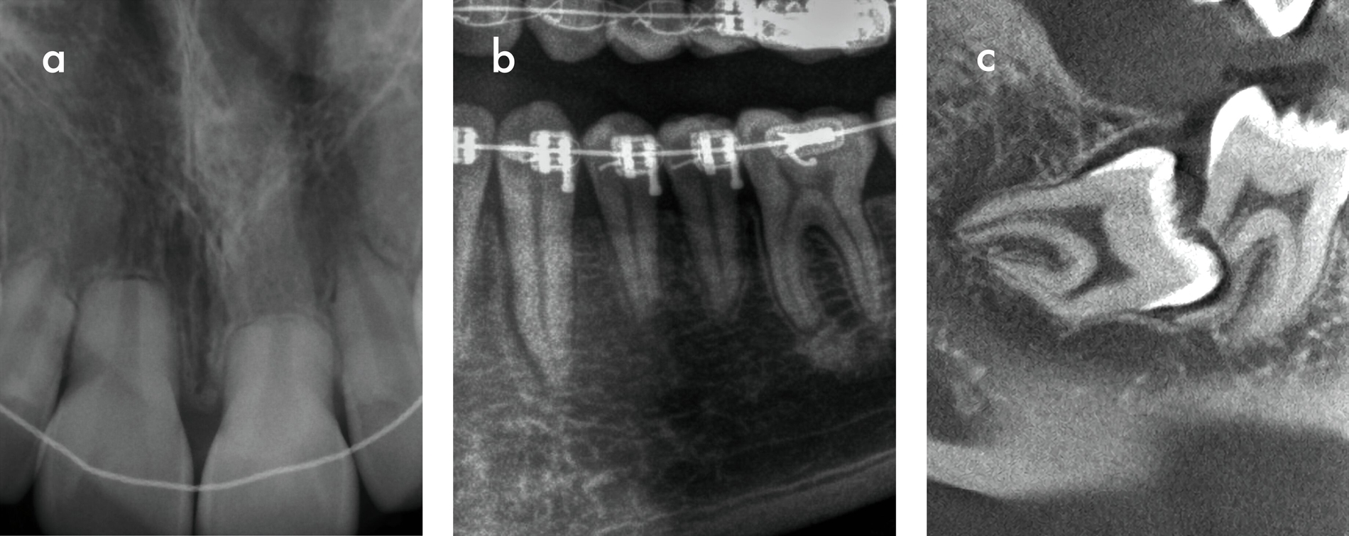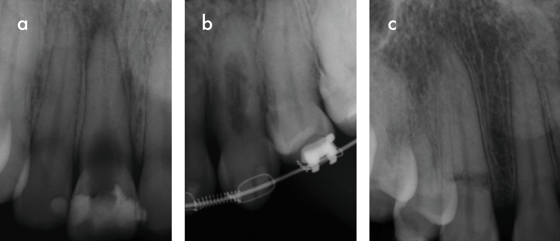 Eine Sonderform interner Wurzelresorptionen tritt im Rahmen von Reparaturvorgängen nach intraalveolären Wurzelfrakturen auf. Diese verlaufen häufig transient (Abbildung 4c). Eine klinische Symptomatik ist in der Regel nicht vorhanden, radiologisch lassen sich jedoch transiente Umbauprozesse entlang der Frakturlinie nachweisen [Andreasen, 2003; Andreasen und Andreasen, 1988].