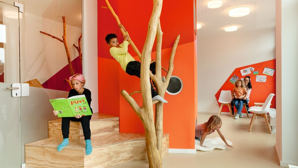 Die Hamburger Praxis Kinderlieb war ein Neubau. Die Immobilie war quasi eine leere Hülle, die wir mit Leben gefüllt haben. Zum Vergleich, wie die Räume Gestalt angenommen haben, eignet sich der Blick in den Warteraum auf die Spielhöhle – vorher und nachher. Die grauen Trockenbauwände wurden mit Guckfenstern und Farbe gestaltet, sie laden jetzt zum Spielen ein.