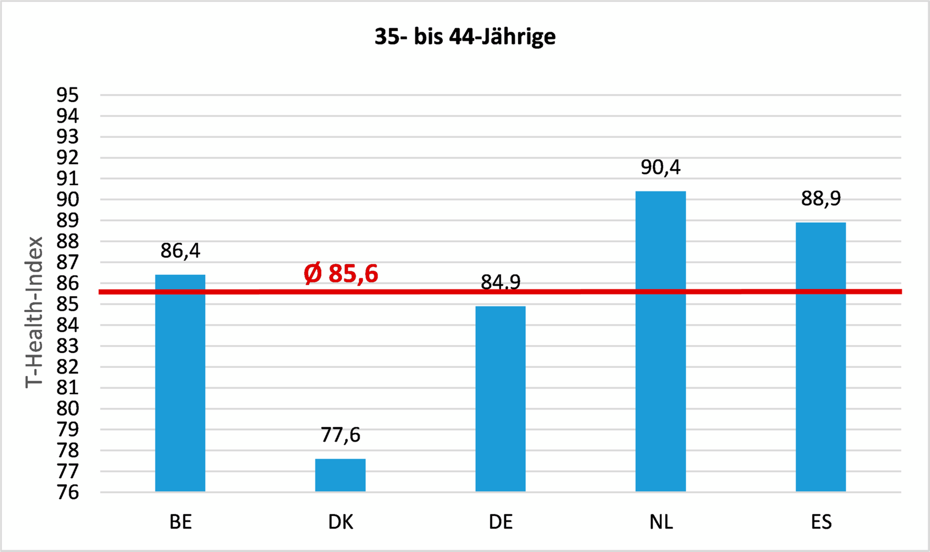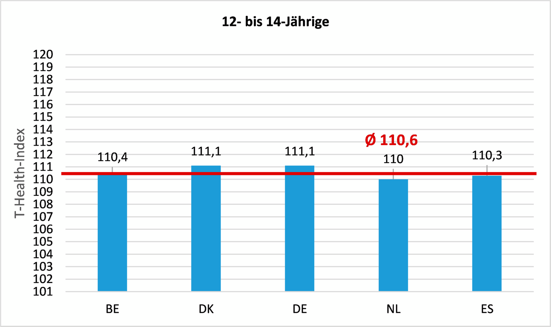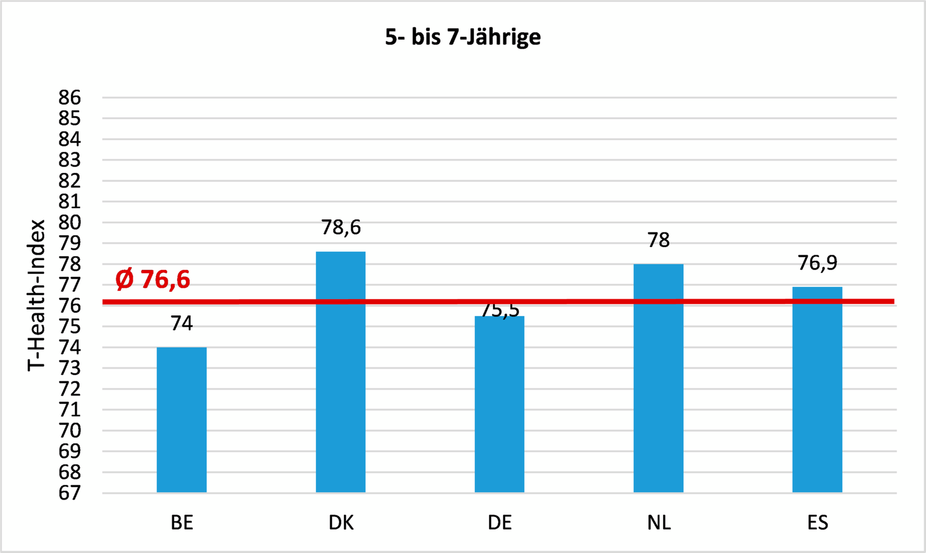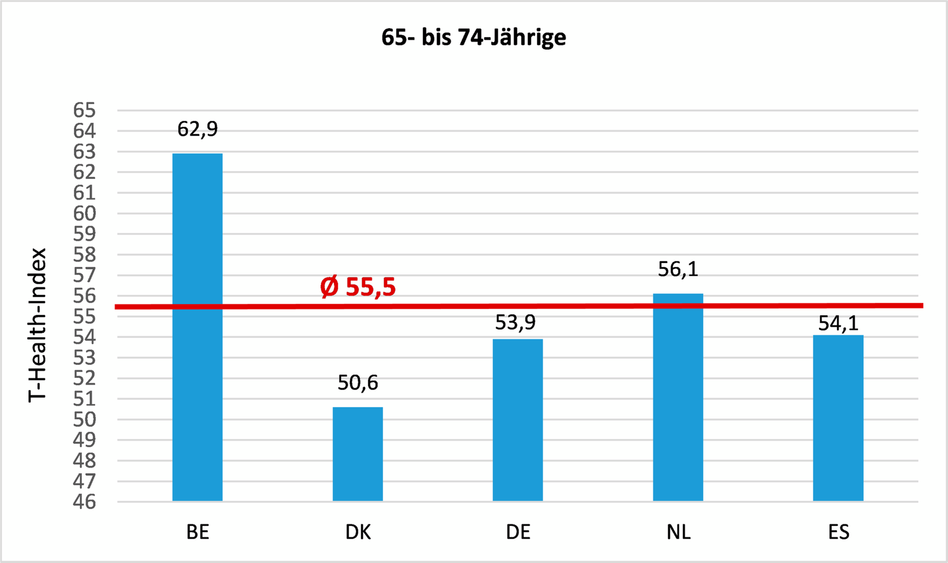 Die Bewertung der Mundgesundheit erfolgte anhand des T-Index, der die unterschiedlichen Gesundheitszustände jedes einzelnen Zahnes mit unterschiedlichen Multiplikatoren bewertet und dann aufaddiert. Die Länder wurden in Form von Balkendiagrammen verglichen und ein Durchschnitt über alle fünf Länder wurde gebildet. Daran kann man Abweichungen nach oben (gut) beziehungsweise nach unten (schlecht) erkennen. Deutschland steht bei den älteren Kindern sehr gut da, auch bei den Senioren sind die Ergebnisse gut (Abbildung 2).