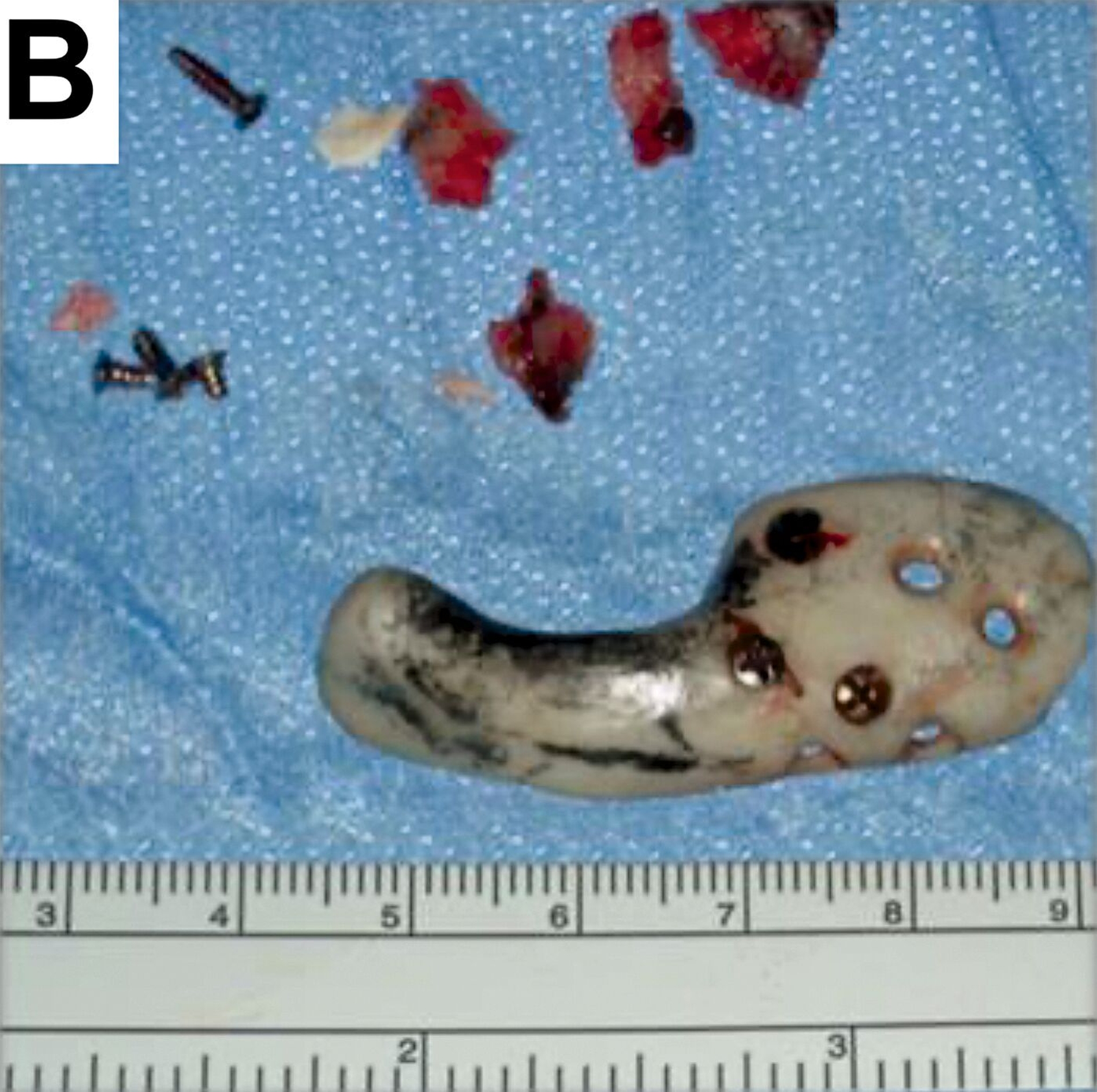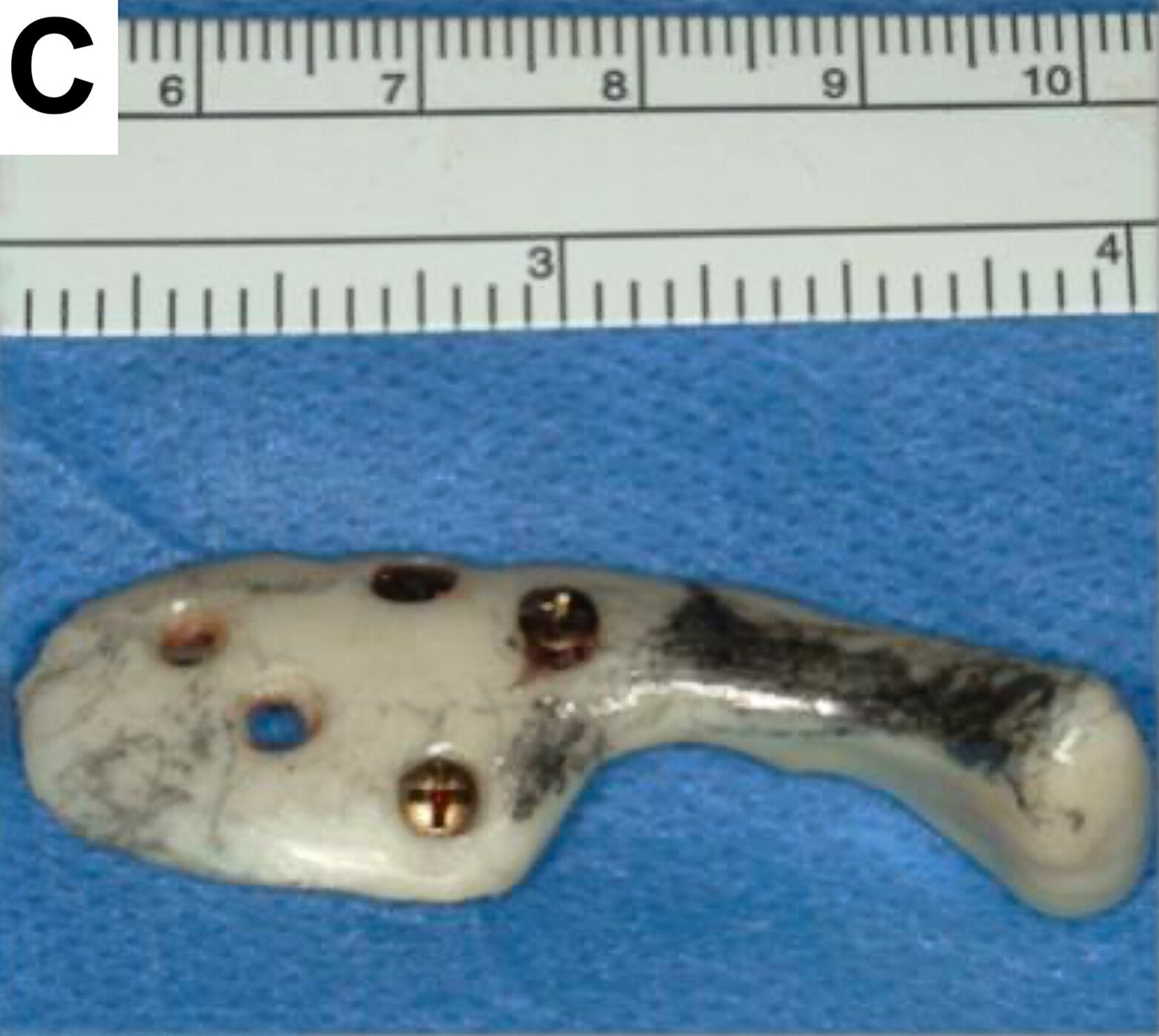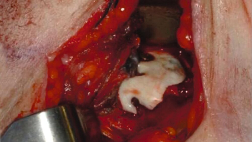 Um eine weitere Dislokation nach intrakraniell zu vermeiden, erfolgte eine Woche nach der Erstvorstellung der Patientin die Entfernung des Endoprothesenwerkstücks (Abbildung 2).