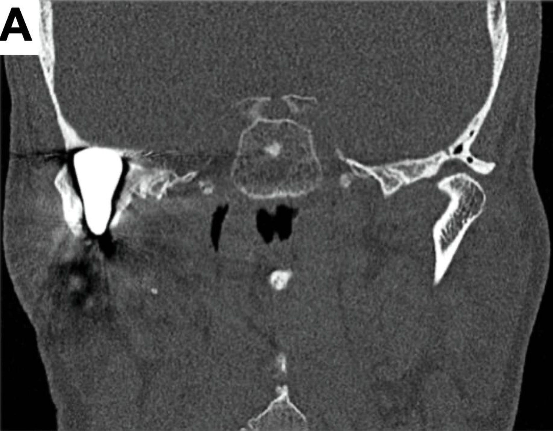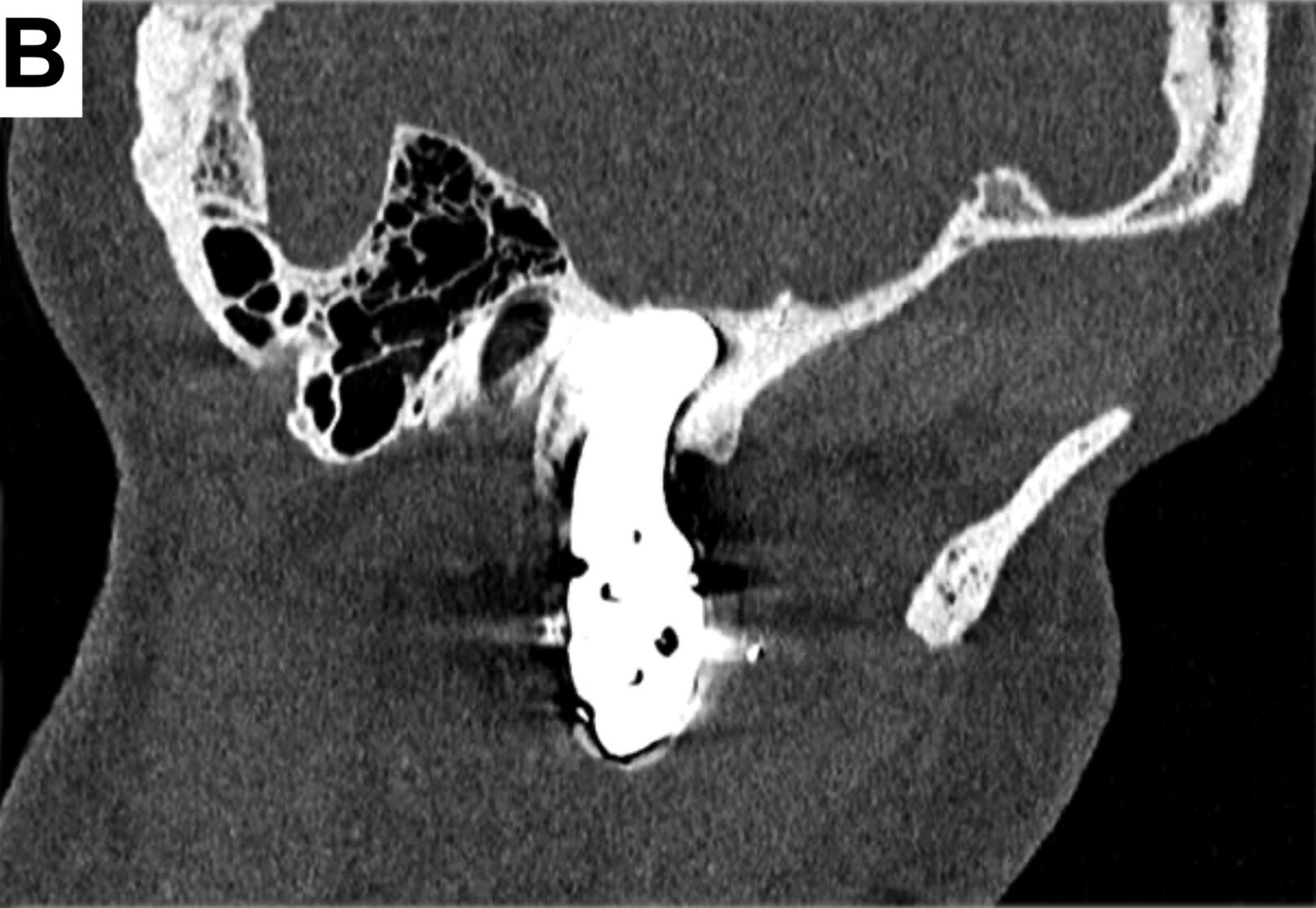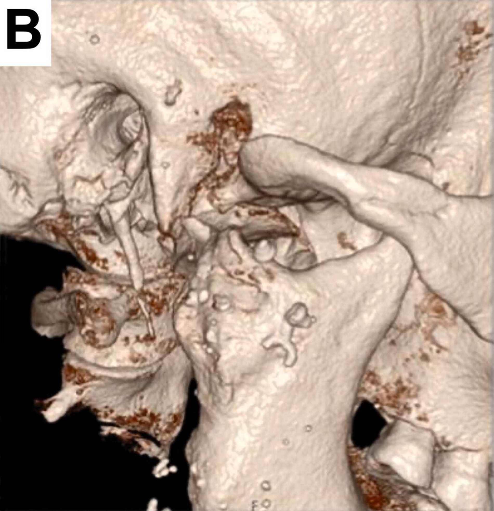 Bei der computertomografischen Untersuchung, die während der Patientenvorstellung durchgeführt wurde, wurde der totale Ersatz des rechten Kondylus durch die bereits beschriebene Endoprothese festgestellt, jedoch ohne Ersatz der Fossa mandibulae, was einem partiellen Kiefergelenkersatz entsprach. Das in situ befindliche Prothesenwerkstück hatte bereits zu einer nahezu vollständigen Erosion der mittleren Schädelbasis geführt (Abbildung 1).
