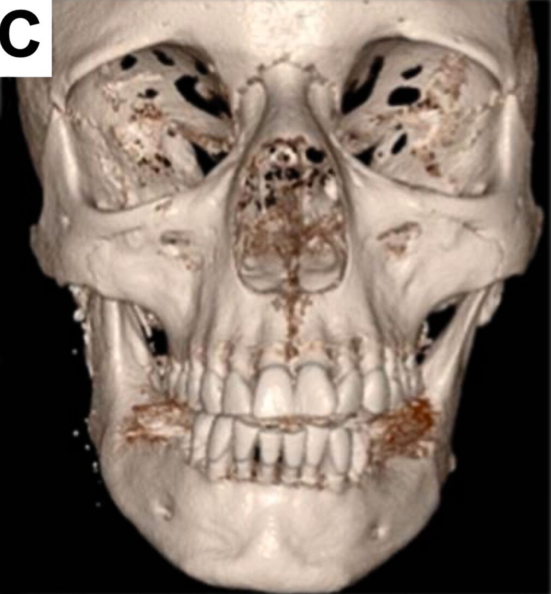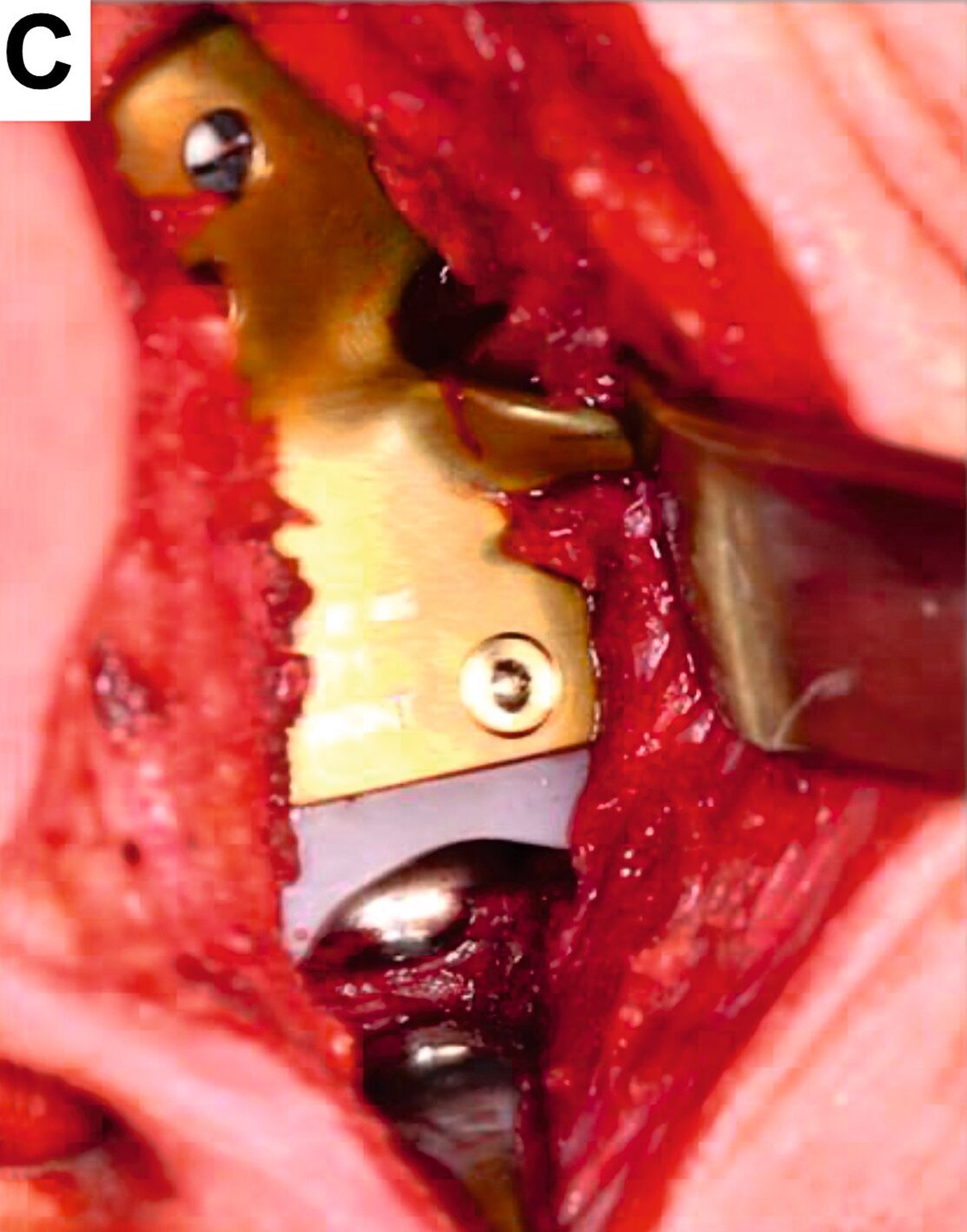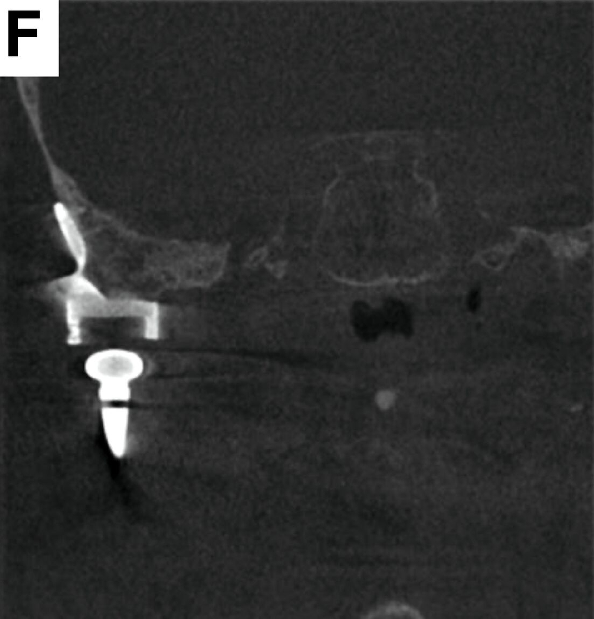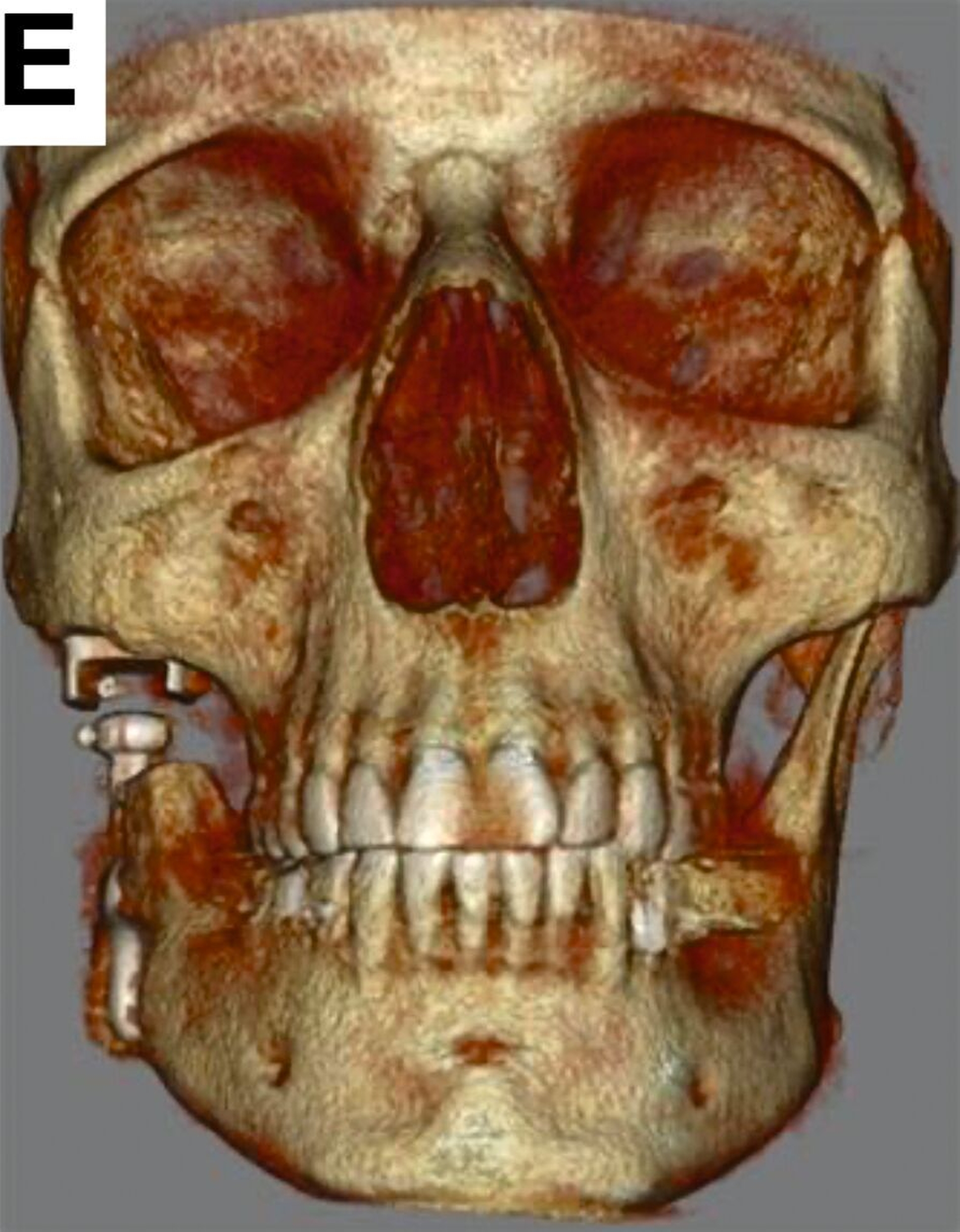 Bei der computertomografischen Untersuchung, die während der Patientenvorstellung durchgeführt wurde, wurde der totale Ersatz des rechten Kondylus durch die bereits beschriebene Endoprothese festgestellt, jedoch ohne Ersatz der Fossa mandibulae, was einem partiellen Kiefergelenkersatz entsprach. Das in situ befindliche Prothesenwerkstück hatte bereits zu einer nahezu vollständigen Erosion der mittleren Schädelbasis geführt (Abbildung 1).