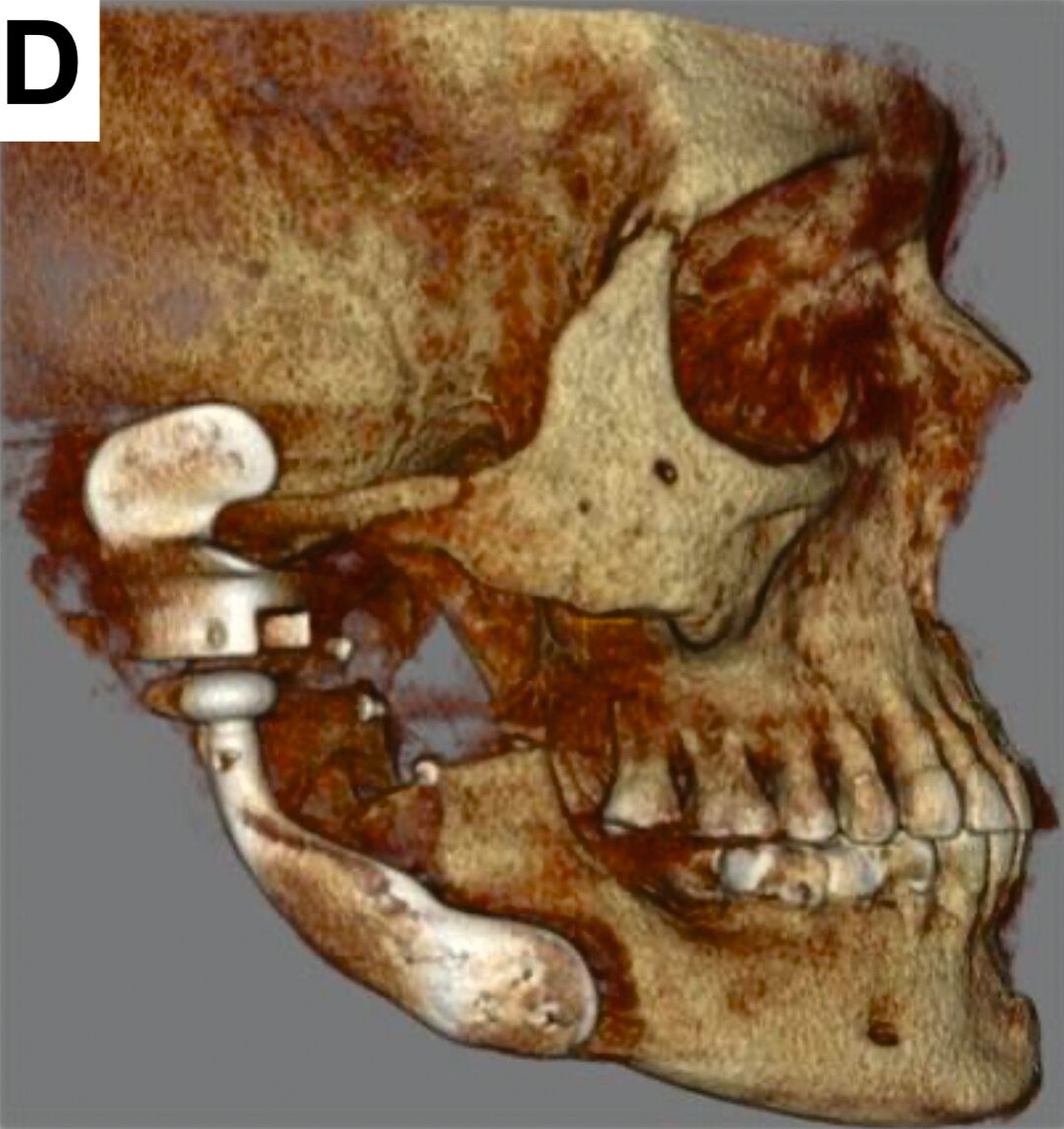 Die finale patientenspezifische CAD/CAM-Kiefergelenkendoprothese wurde von der Firma Materialise in Löwen, Belgien, hergestellt. Vier Monate nach der Explantation konnte die Patientin erfolgreich mit Ersatz von Kondylus und Fossa mandibularis versorgt werden (Abbildung 4).