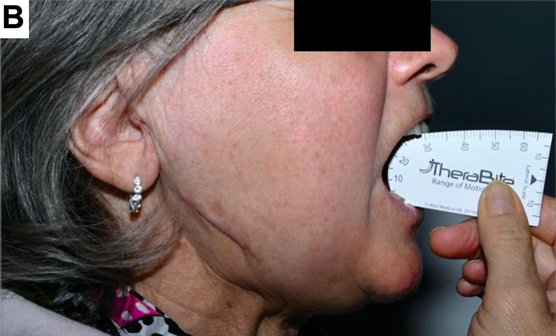 Der postoperative Verlauf verlief unauffällig, so dass bereits nach vier Wochen mit leicht dehnenden Mundöffnungsübungen begonnen werden konnte (Abbildung 5).
