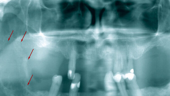 Eine 32-jährige Patientin stellte sich mit Parästhesien im linken Unterkieferbereich in einer oralchirurgischen Praxis in Foggia (Italien) vor. Sie berichtete, dass die Beschwerden seit fünf Tagen bestanden und sie vor drei Jahren eine radikale Bimastektomie wegen eines invasiven lobulären Mammakarzinoms hatte. Sie erhielt Chemotherapie und Bestrahlung sowie eine Dauertherapie mit 4 mg Zoledronsäure intravenös alle drei Wochen. Intraorale zeigte sich eine gute Mundhygiene, keine Schwellungen, Fisteln oder offene Schleimhaut. Auffällig waren allerdings regionale Lymphknotenschwellungen submandibulär sowie eine von extraoral tastbare, leichte Schwellung im Bereich des Kieferwinkels linksseitig. Es wurden ein PET-CT sowie ein DVT angefertigt.