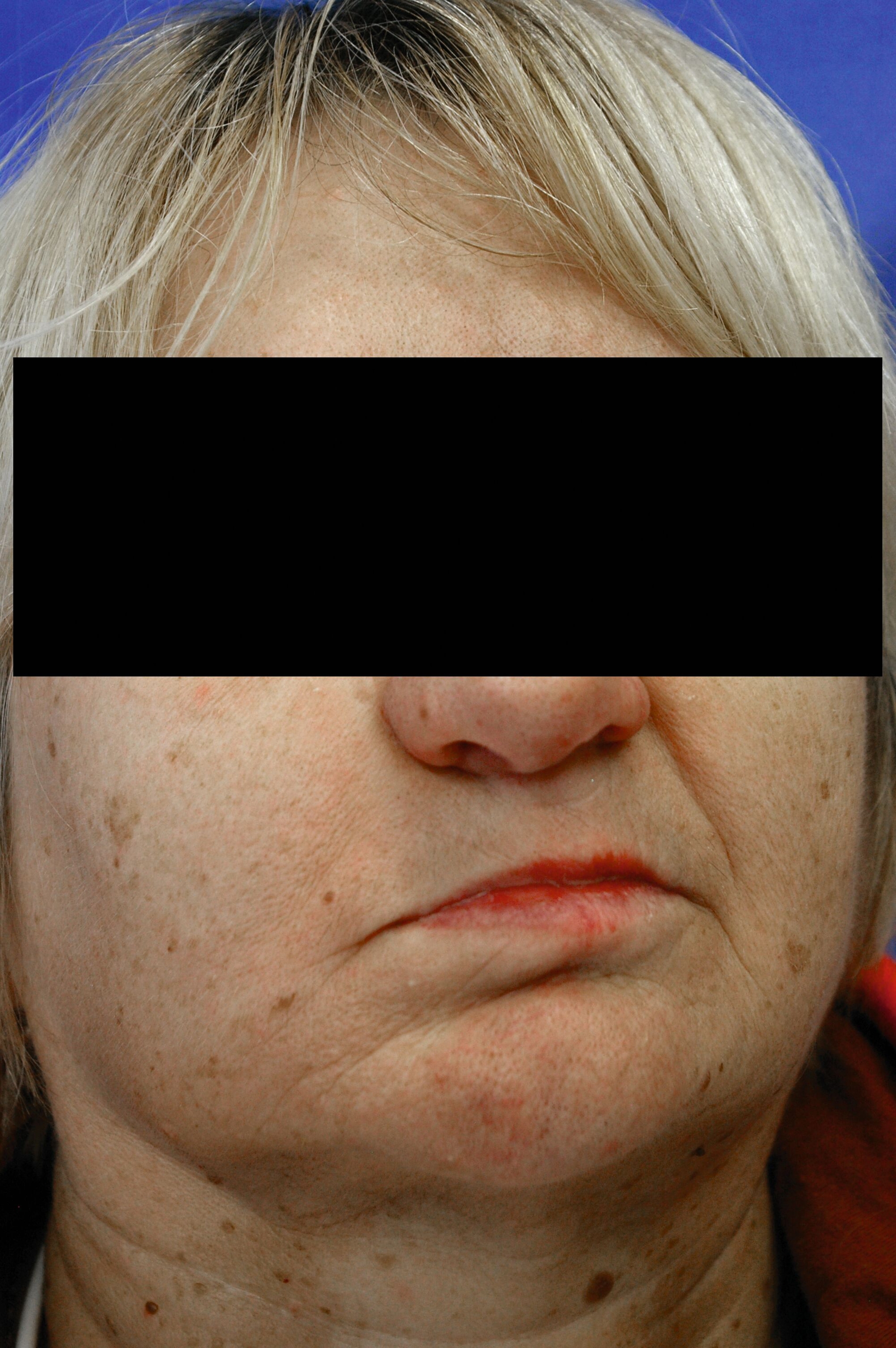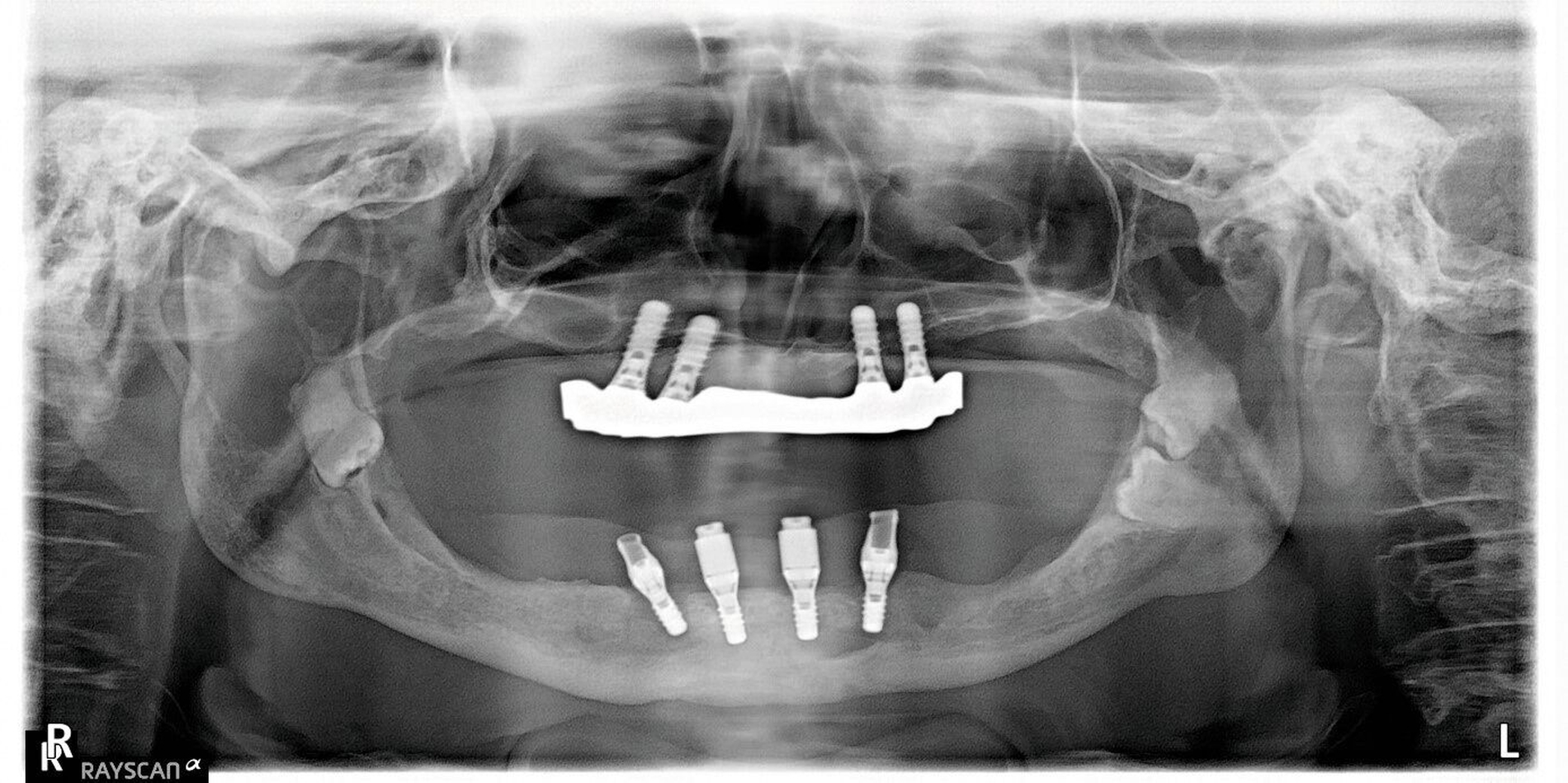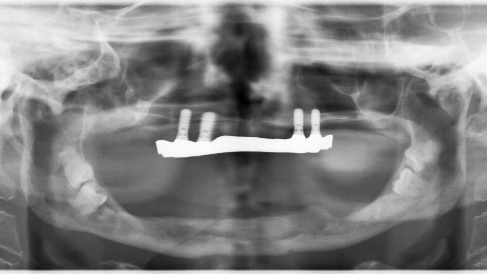 Eine 65-jährige Frau wird mit Beschwerden im Kieferwinkel von der behandelnden Zahnärztin zugewiesen. Sie leidet an einer idiopathischen Fazialisparese sowie unter Druckstellen einer frei beweglichen Totalprothese im Unterkiefer. Im Oberkiefer trägt sie eine implantatgestützte, steggetragene Deckprothese.