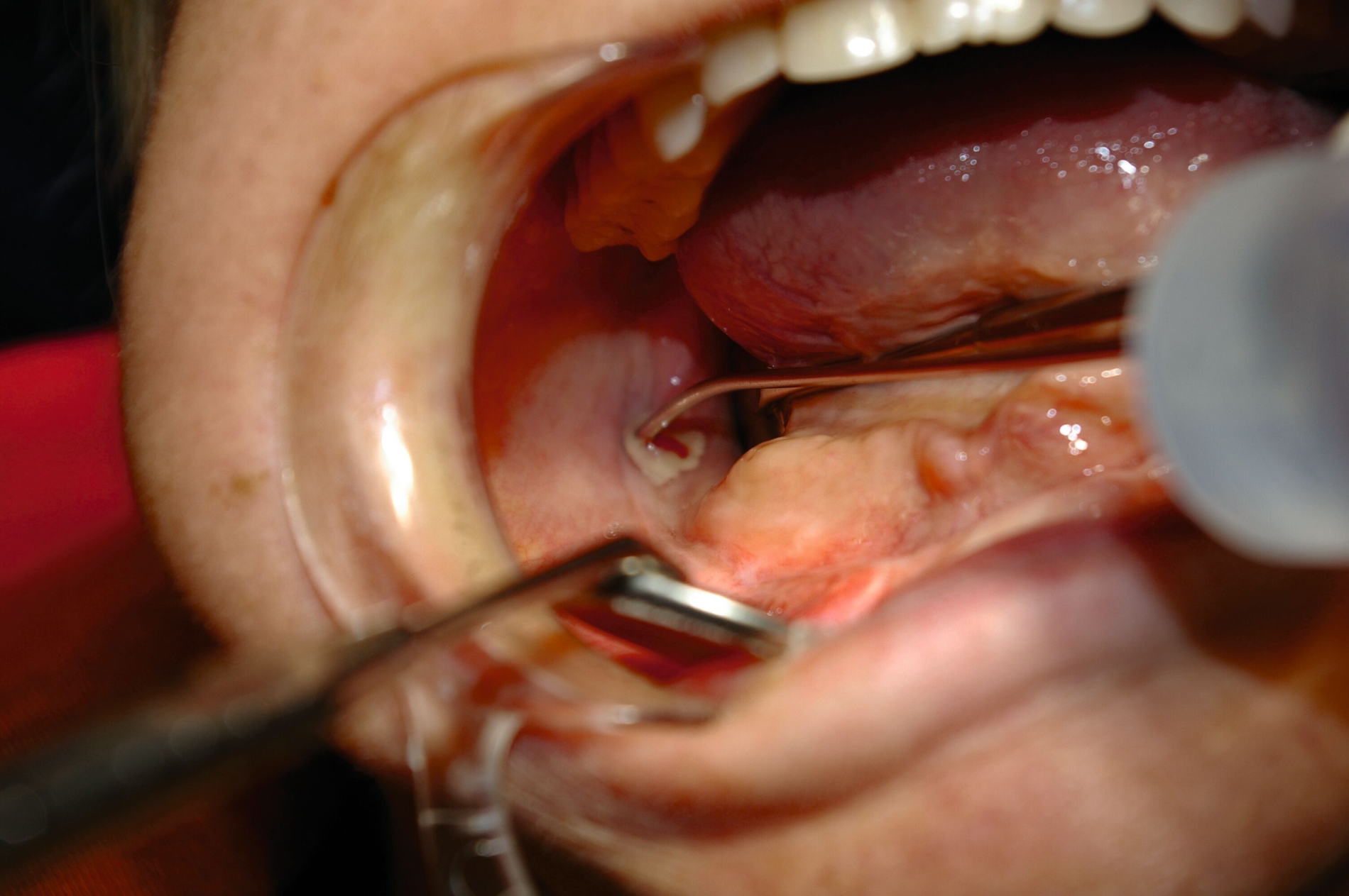 Nach Lokalbehandlung der akuten Entzündung erfolgt in nasaler Intubationsnarkose (ambulantes MedizinZentrum Lichtenberg, Sana-Klinikum Berlin) die Entfernung des kariösen retinierten Zahns mit Ausräumung der Entzündung. Der blande, hochretinierte Distomolar wird ebenso wie die Zähne der Gegenseite belassen, die Resektionshöhle im rechten Kieferwinkel mit Beckenkammspongiosa verfüllt.