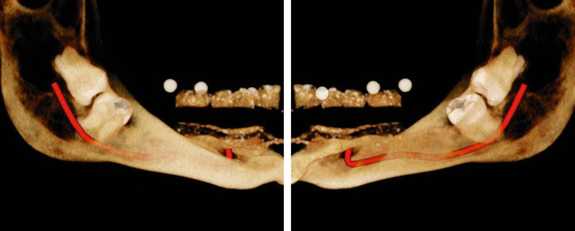 In der Panoramaschichtaufnahme sind beidseits in den aufsteigenden Ästen des Unterkiefers verlagerte Zähne 39, 38, 48 und 49 zu erkennen (Abbildung 1). Der anteriore Alveolarfortsatz erscheint in der zweidimensionalen Projektion ausreichend hoch zu sein.