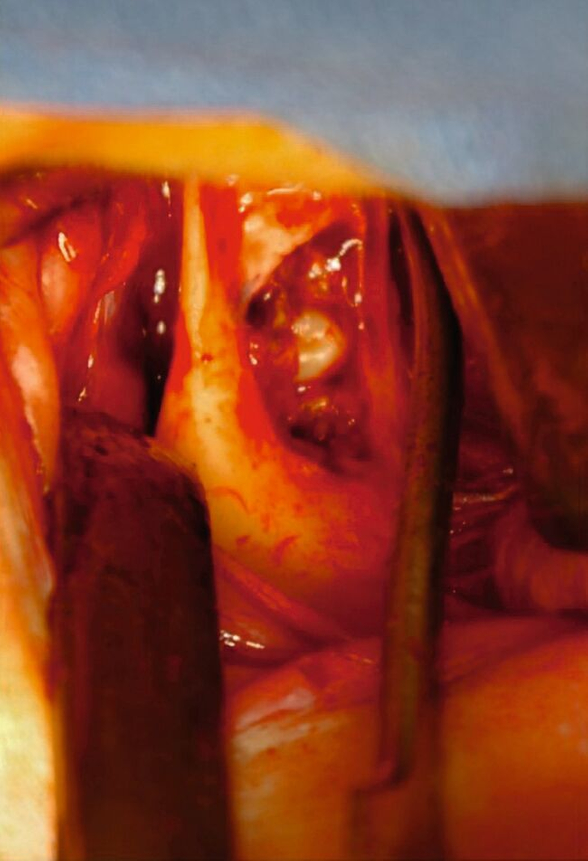 In der klinischen Untersuchung imponiert extraoral rechtsseitig ein muskulärer Tonusverlust mit Bell‘schem Phänomen sowie intraoral ein hochstehender Mundboden der Gl. sublingualis hinter einem palpatorisch breit wirkenden anterioren Alveolarfortsatz. Im rechten Kieferwinkel findet sich lingual eine suppurierende Fistel (Abbildung 3).