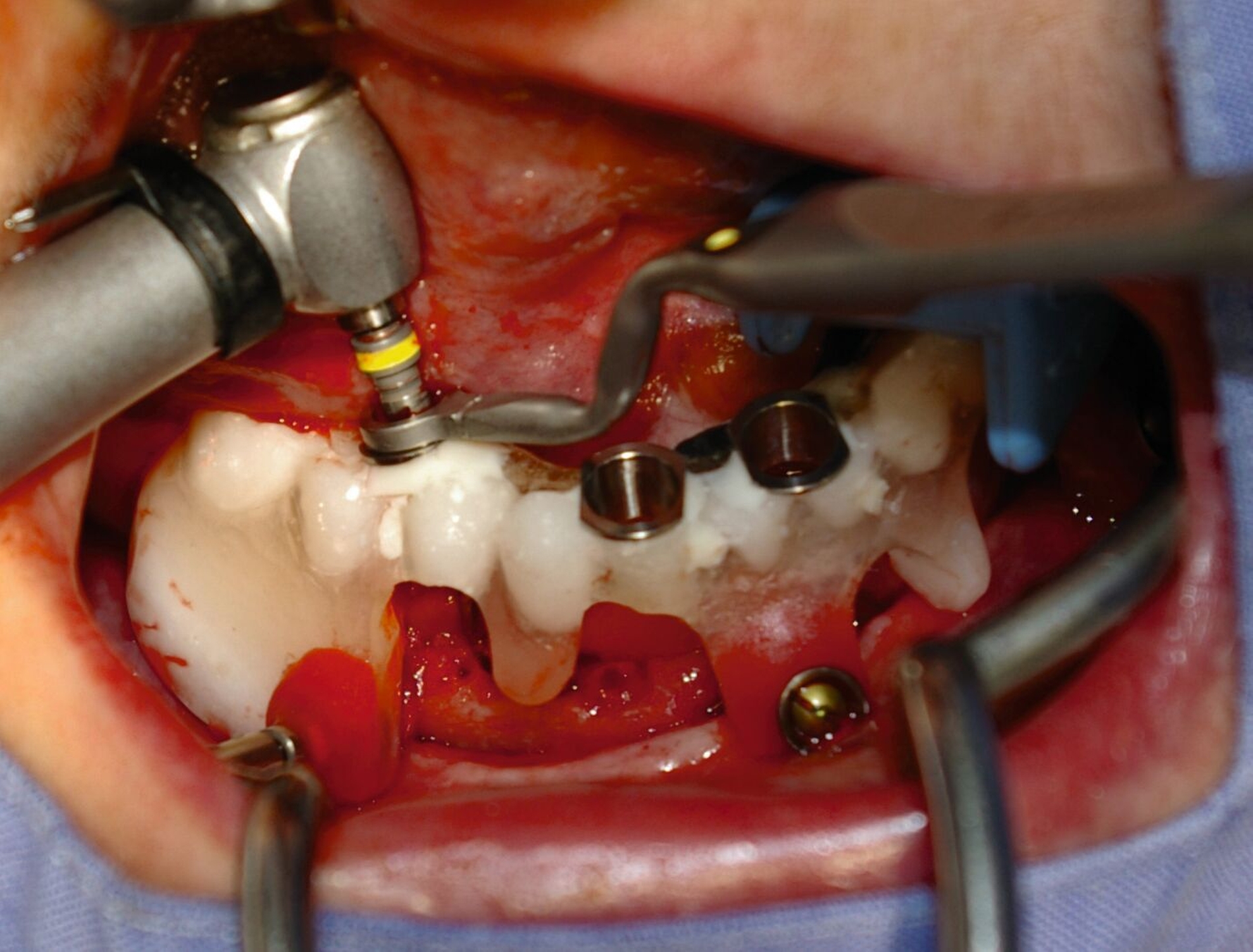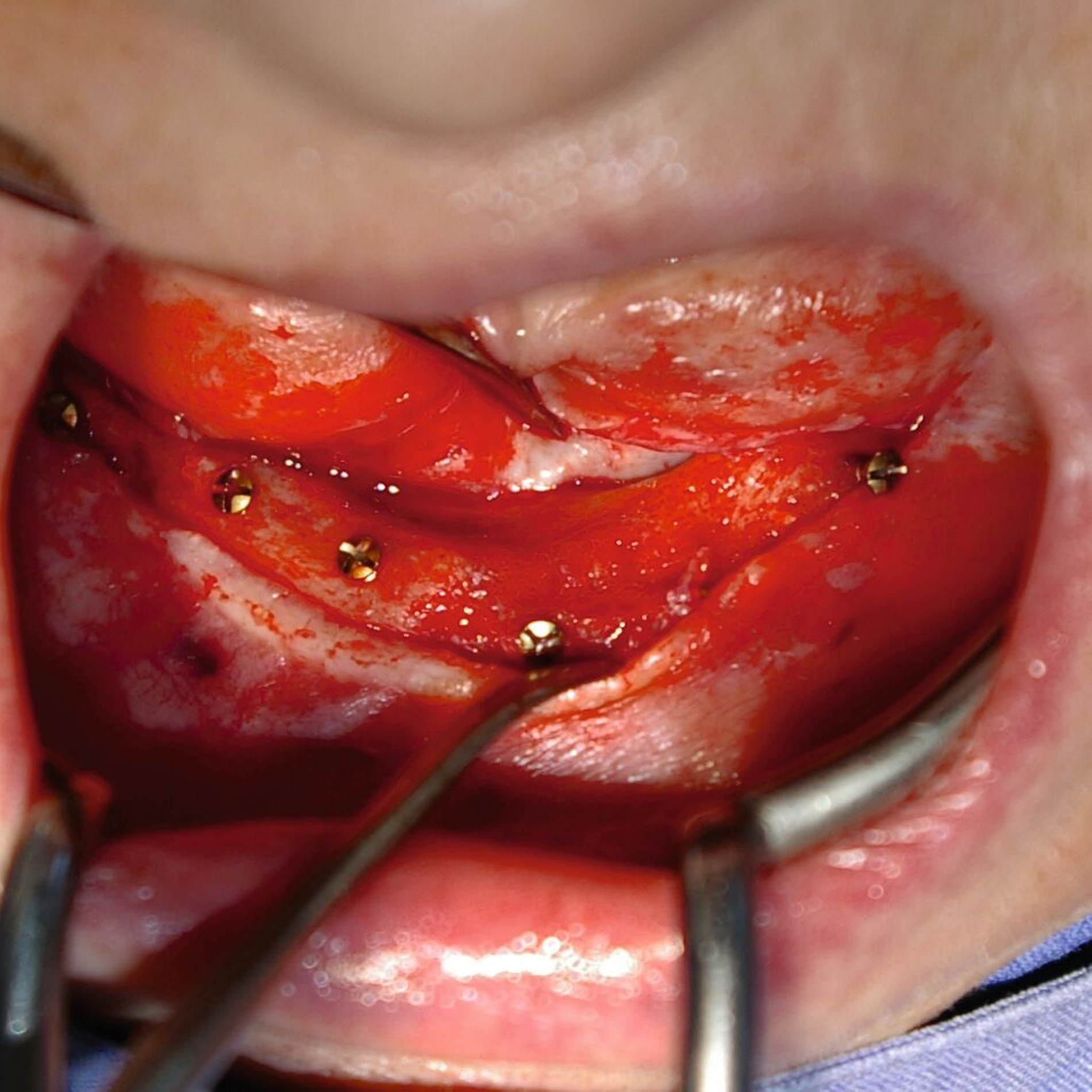 Im anterioren Bereich des Unterkiefers erfolgt eine vestibulo-crestale Verschalung durch schraubenfixierte (Osteosyntheseschrauben Mini 2,0, KLS Martin, Tuttlingen) Beckenkammspäne.