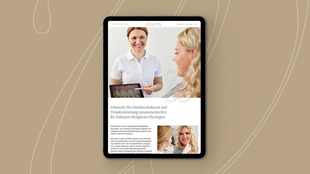 Besondere Beachtung verdient neben Naming und Corporate Design die Praxis-Homepage. Sie ist als Visitenkarte im Internet oft der erste Anknüpfungspunkt für potenzielle Neupatienten und damit unverzichtbar für Praxen auf Wachstumskurs – wie feinwerk. Dabei kommt es einerseits auf das Website-Layout an. Es sollte ebenfalls dem roten Faden des Corporate Designs folgen und dabei übersichtlich und von der Nutzung intuitiv gestaltet sein.