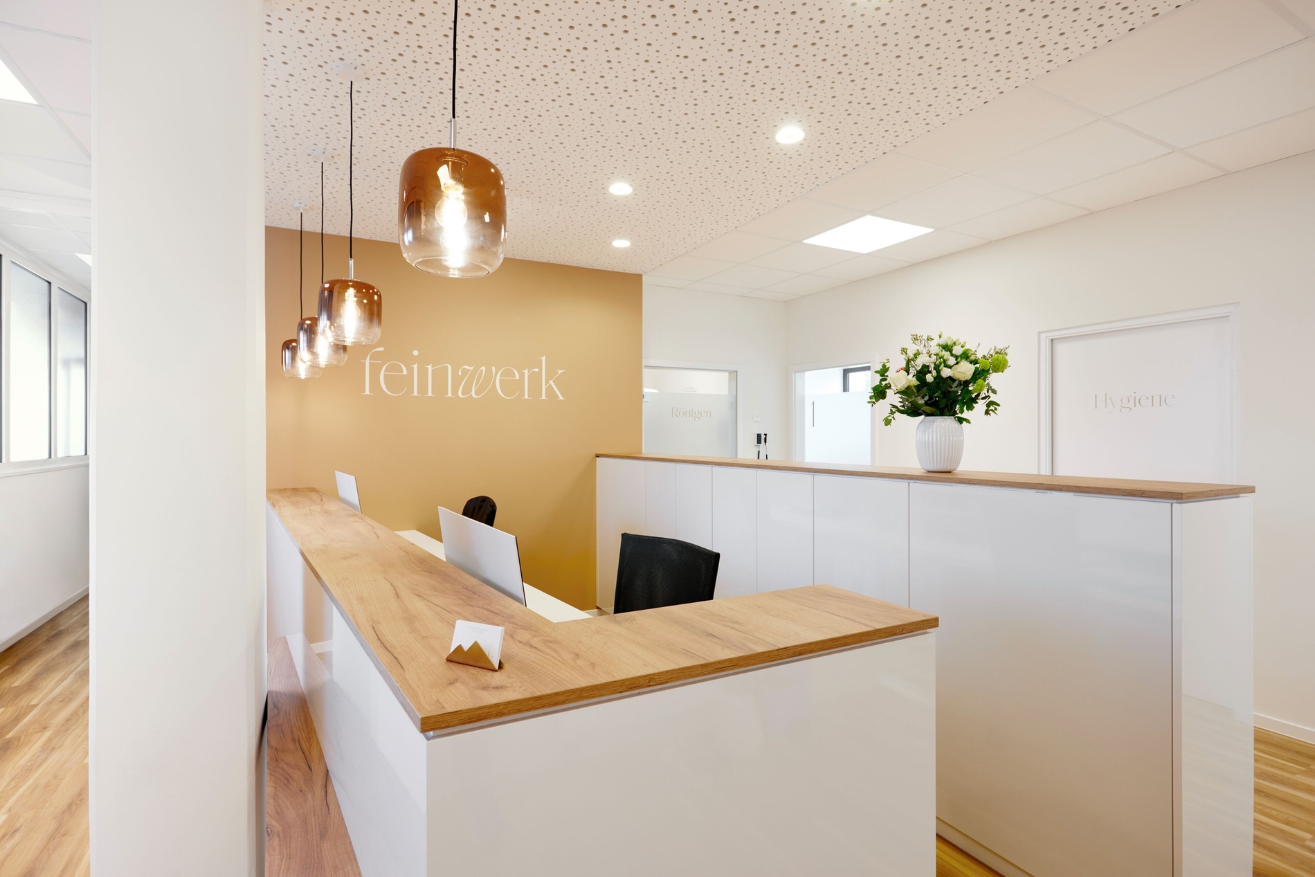 Damit sich das Corporate Design in der Praxis wiederfindet, hat Hoffmann sich im Zuge der Renovierung für einen markanten Look am Praxisempfang entschieden: Das Naming liegt in Weiß auf einer großflächig in ihrem Goldton gestrichenen Wand und auch die Folierung der einzelnen Praxisräume nimmt die Typografie der Wortmarke wieder auf.
