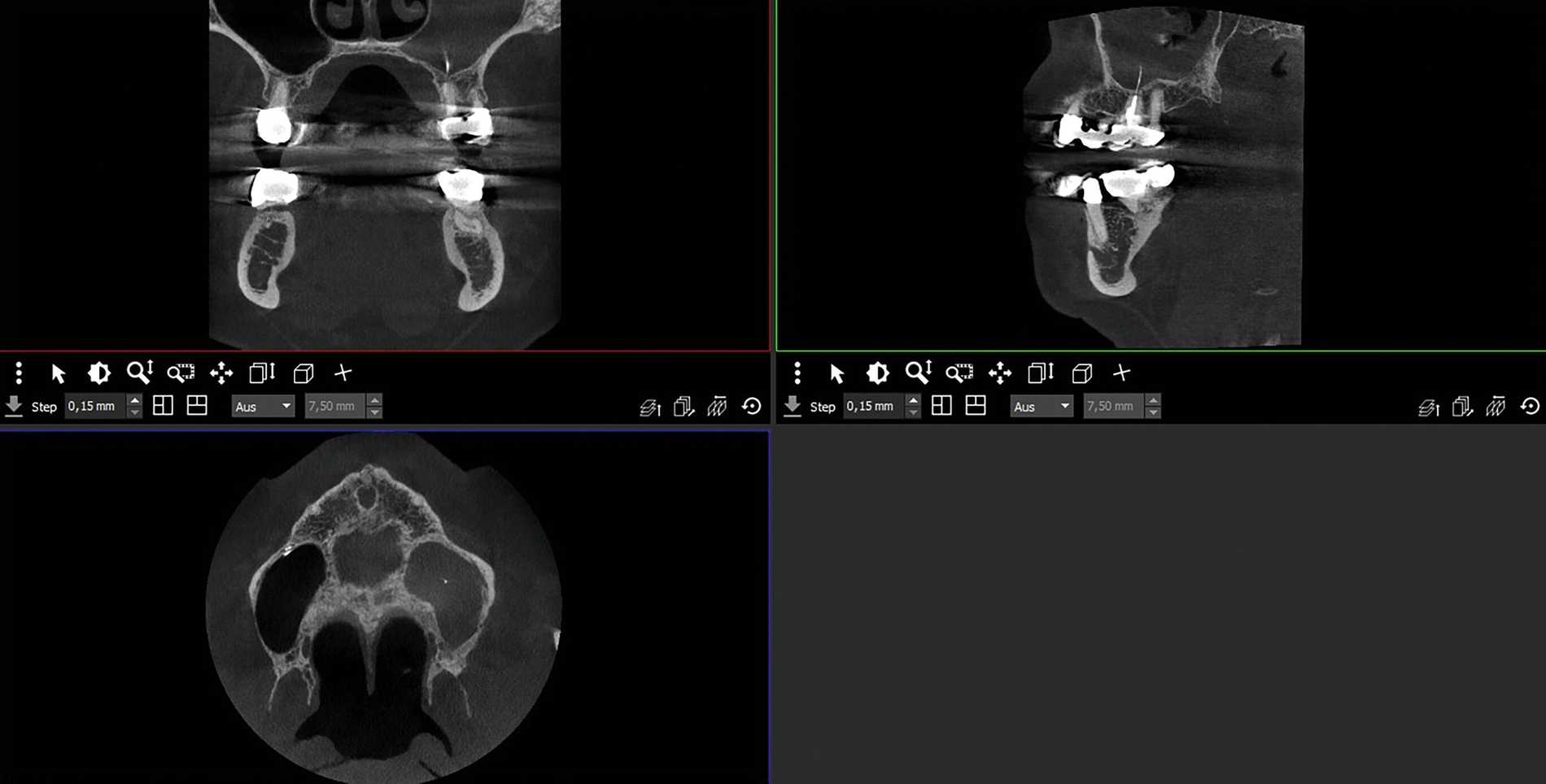 Bei der erneuten Vorstellung in der HNO-Abteilung etwa ein Jahr später berichtete die Patientin über eine seit Monaten bestehende Schwellung prämaxillär links sowie gelegentliche gelbliche Rhinorrhoe. Sie hatte zunächst eine niedergelassene HNO-Kollegin konsultiert, die eine DVT-Untersuchung durchführte, bei der eine Verschattung des linken Sinus maxillaris, verursacht durch eine überstopfte palatinale Wurzelfüllung am Zahn 26, nachgewiesen wurde (Abbildung 2).