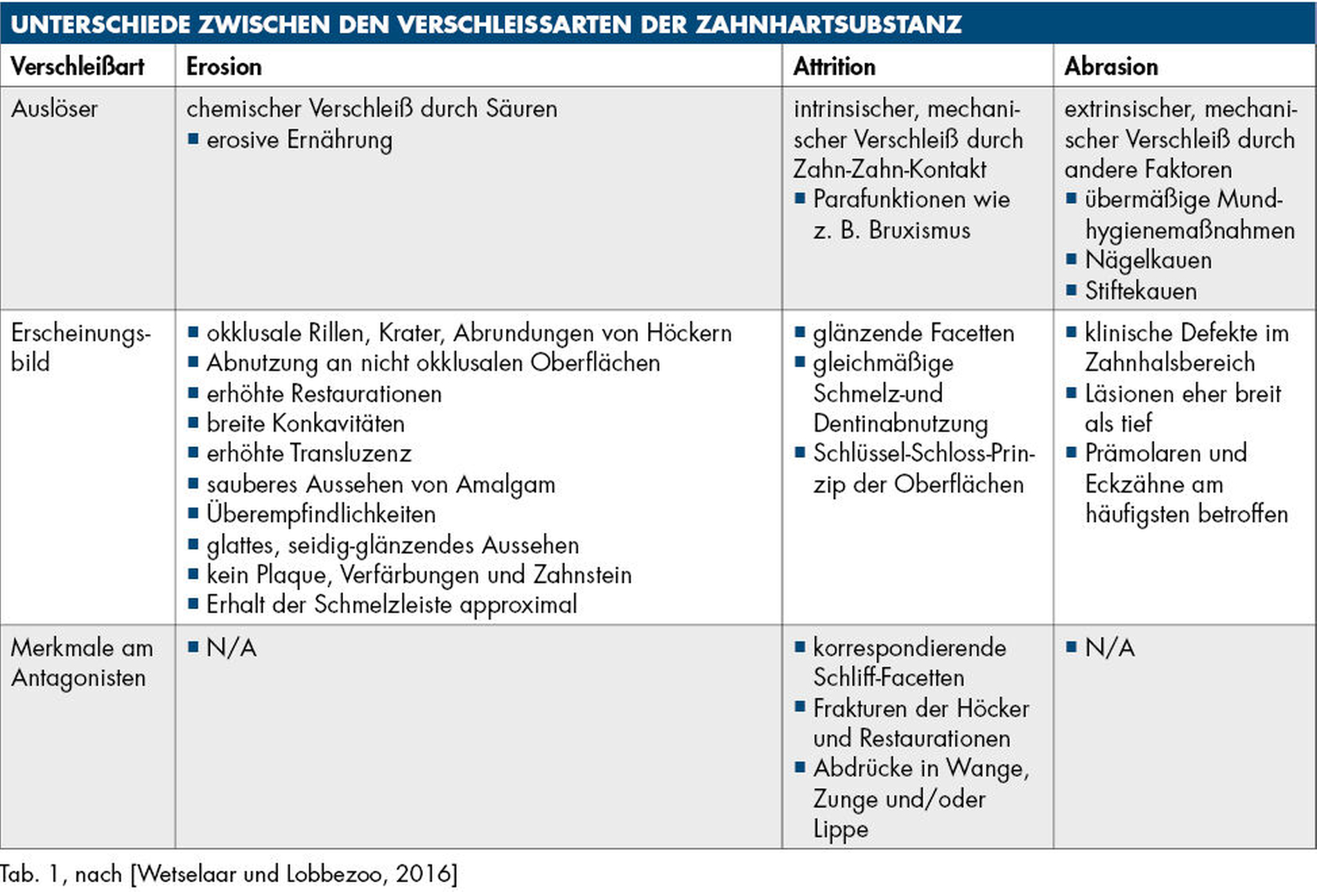 Neben den traumatisch bedingten nicht-kariösen Zahnhartsubstanzschäden existieren drei weitere stark verbreitete Arten, die sich alle durch den Verlust von Schmelz, Dentin beziehungsweise Zement auszeichnen: Erosion, Attrition und Abrasion. Da bei unterschiedlichen Ursachen verschiedene Präventions- und Therapiemaßnahmen ergriffen werden müssen, ist es wichtig, diese voneinander zu unterscheiden.