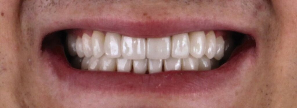 Da der Patient mit der Situation zufrieden war, konnte nach einigen Wochen die endgültige Versorgung bestehend aus Lithiumdisilikat-Kronen (e.max®, Ivoclar, Schaan, Liechtenstein) adhäsiv mit einem dualhärtenden Befestigungskomposit (RelyXUltimate™, 3M™, Neuss) eingesetzt werden. Der Patient bekam außerdem eine Unterkiefer-Aufbissschiene mit adjustierter Kaufläche für die Nacht.