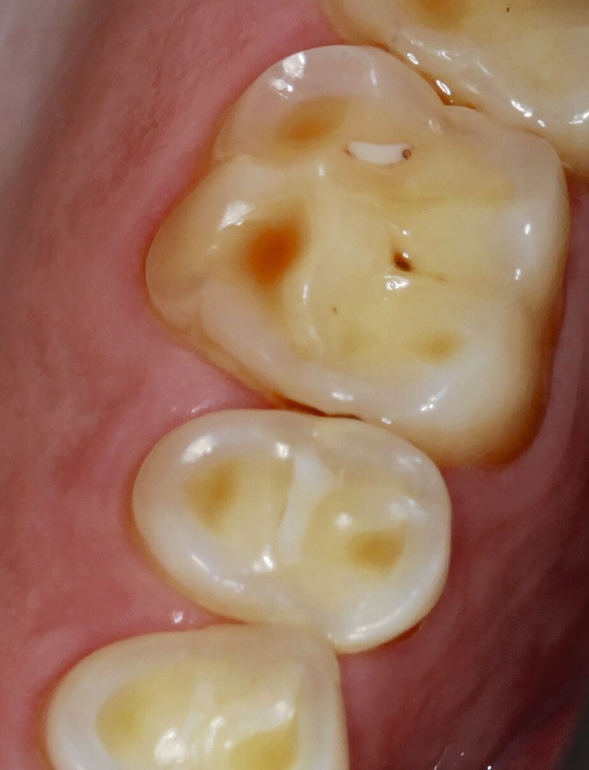 Klinisch präsentierte sich ein vollbezahntes Gebiss ohne Weisheitszähne mit Defekten an der Zahnstruktur teilweise bis ins Dentin. Es waren deutliche Erosionsspuren zu erkennen, die auf die säurehaltige Ernährung im Kurzzeitintervall zurückgeführt wurden. Der BEWE-Index war mit dem Wert 13 auffällig und kategorisierte den Schaden als ausgeprägte Erosionen. Die Zähne 14, 13 und 24 wiesen nicht-kariöse zervikale Defekte auf, diese treten häufig im Zusammenhang mit Bruxismus auf [Pecie et al., 2011]. Das CMD-Screening der Deutschen Gesellschaft für Funktionsdiagnostik und -therapie (DGFDT) [DGFDT, 2024] war unauffällig, da der Patient über keinerlei Schmerzen oder Beschwerden bei Kieferbewegungen klagte. Die manuelle Strukturanalyse (MSA) nach Bumann [Fasold und Kordaß, 2012] ergab bei diesem Patienten ein myofaziales Schmerzsyndrom. Im Prämolarenbereich imponierten Zahnhartsubstanzdefekte, die Hinweise auf starkes und häufiges Zähnepressen geben. Den Patienten selbst störten seine kälteempfindlichen Zähne sowie die Gesamtästhetik aufgrund des massiven Substanzverlustes.