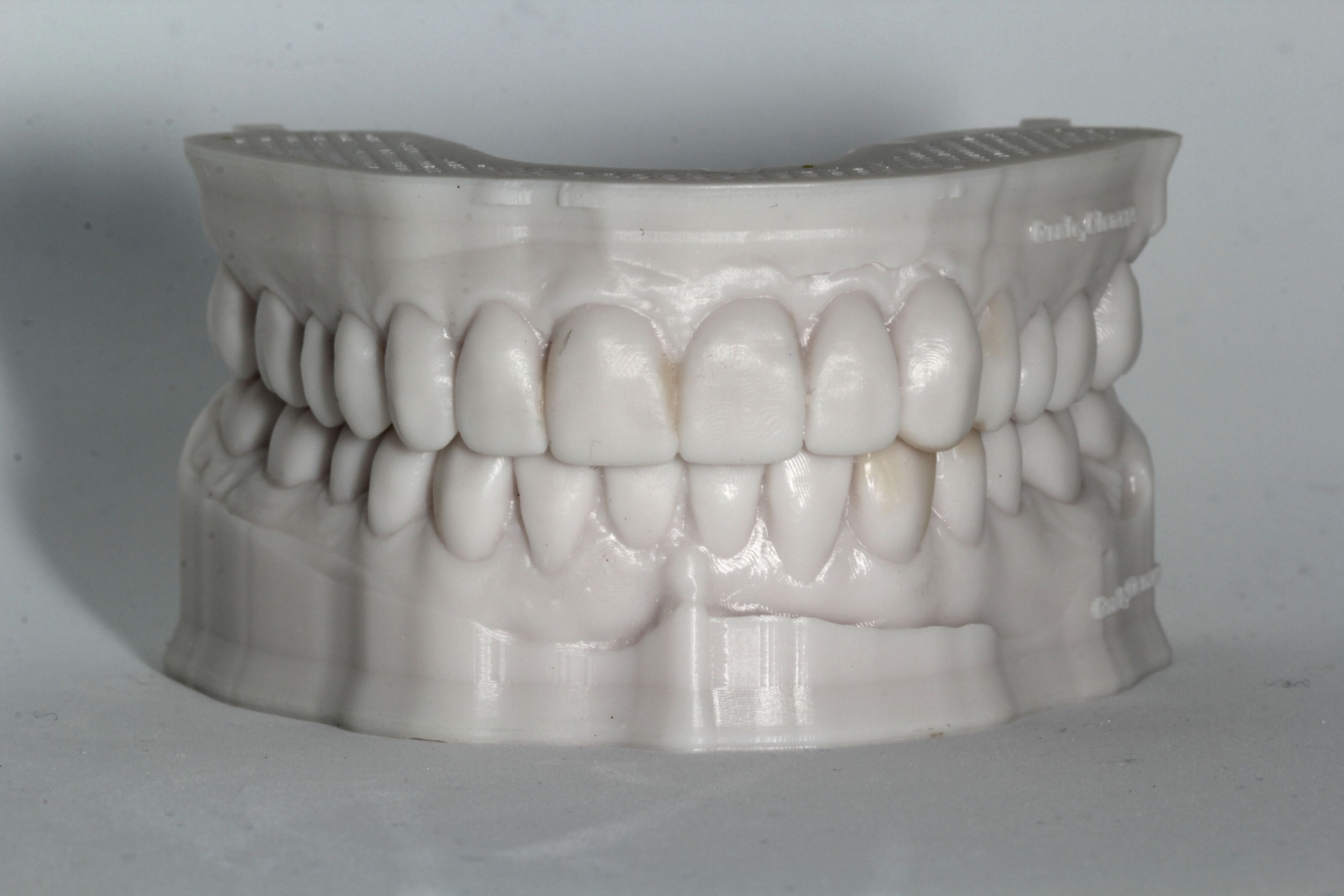 Zu Beginn wurden mit Alginat Abformungen der Ausgangslage genommen. Anhand der Situationsmodelle konnten mithilfe einer Modellanalyse nach dem Udo-Plaster-Protokoll [Plaster und Köttgen, 2020] Rückschlüsse auf einen vertikalen Höhenverlust von etwa 3 - 4 mm gezogen werden. Für die Registrierung der neuen Höhe wurde der Patient mit einer temporären Einweg-Schiene (Aqualizer®, MediPlus GmbH, Unterleinleiter) deprogrammiert. Anschließend wurde am stehenden Patienten ein Bis-Acrylat-basierter Frontzahn-Jig (LuxaBite, DMG, Hamburg) angefertigt, so dass die Bissnahme als vorläufige patientenindividuelle Myozentrikposition reproduzierbar im Seitenzahnbereich mit einem A-Silikon (Kanibite hart, Kaniedenta, Herford) erfolgen konnte. Basierend auf dieser Höhe wurde eine Bisserhöhungsschiene angefertigt, die der Patient über sechs Monate lang trug. Nach einem Intraoralscan des Ober- und Unterkiefers (Primescan, Dentsply Sirona, Bensheim) konnte ein digitales Wax-up erstellt werden. Auf den 3-D-gedruckten Wax-up-Modellen wurde ein Silikonschlüssel für die Mock-up-Versorgung hergestellt und mit einem Bis-Acrylat-Komposit (Luxatemp Star, DMG, Hamburg) umgesetzt.