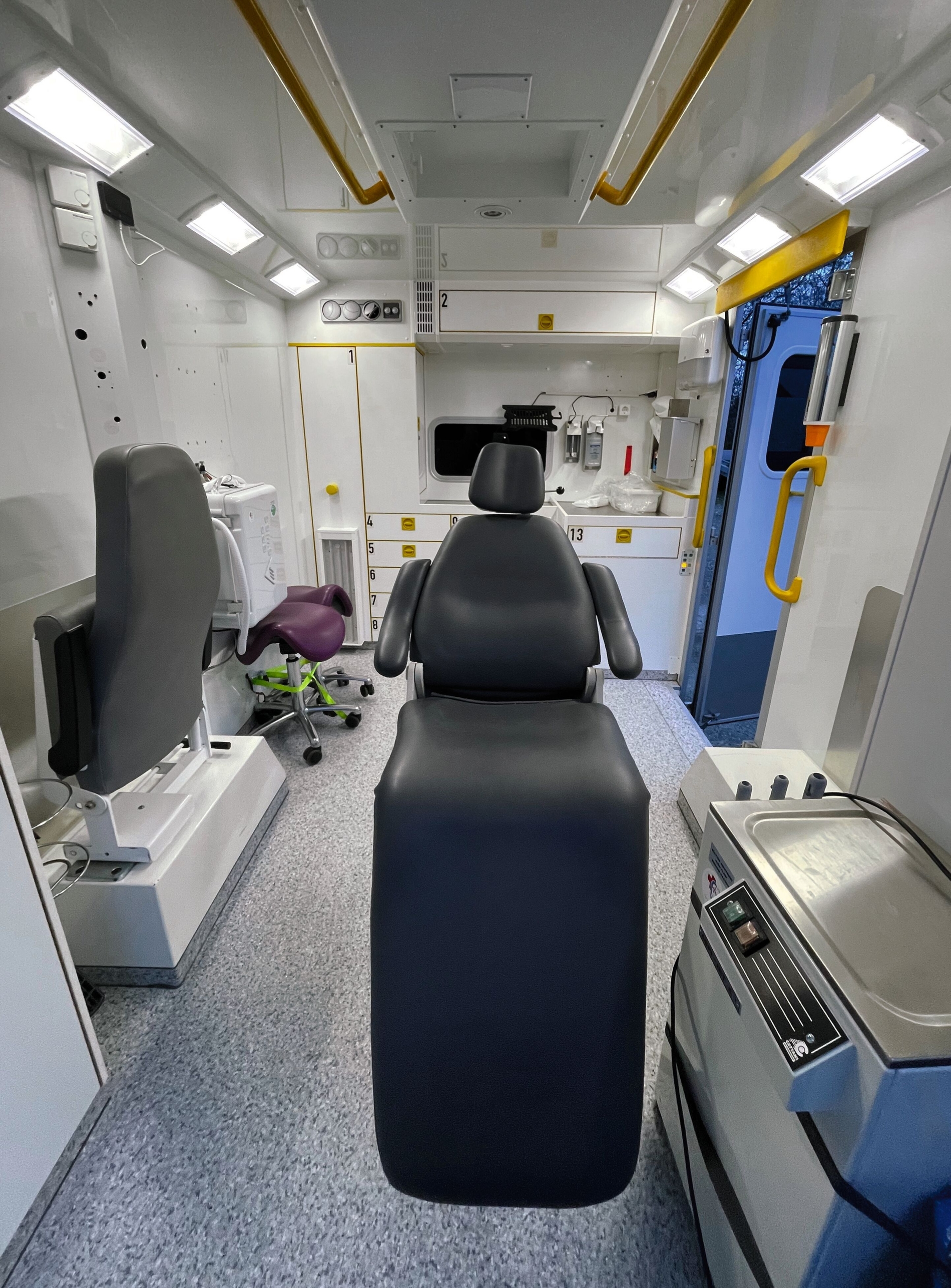 Eine Schwierigkeit bei der Einsatztour war das Gesamtgewicht des ersten Zahnmobils: Es wog über viereinhalb Tonnen und nicht alle Freiwilligen haben den dafür benötigten LKW-Führerschein. Dank der umfangreichen Unterstützung der Firma Dampsoft, die das Dental EMT seit der ersten Stunde begleitet, konnten wir einen weiteren Rettungswagen mit geringerem Gewicht anschaffen, den die Mitglieder des Vereins in Eigenarbeit zu einer mobilen Zahnstation umgebaut haben. Mitte März war es dann soweit: Reinartz und ich überführten den neuen Wagen an die polnische Grenze und stellten ihn im Shelter der Hope Foundation in Przemyśl in Dienst.