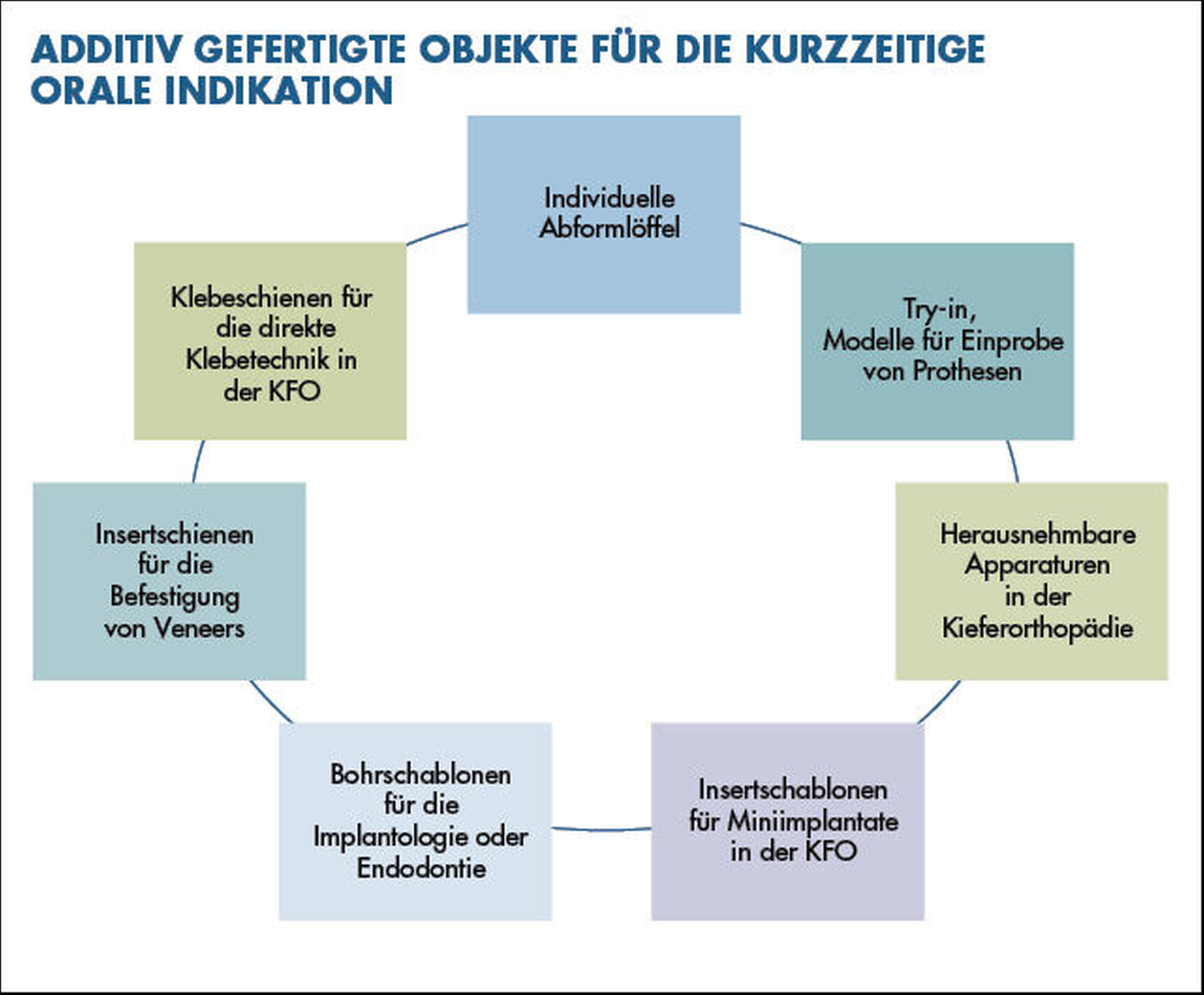 Die Indikationen für mit additiven Technologien gefertigte Objekte sind sehr vielfältig und lassen sich gut nach der klinischen Nutzungsdauer einteilen. Die Werkstoffe müssen für den jeweiligen Fertigungsprozess und die entsprechenden klinischen Anwendungen gewählt werden.