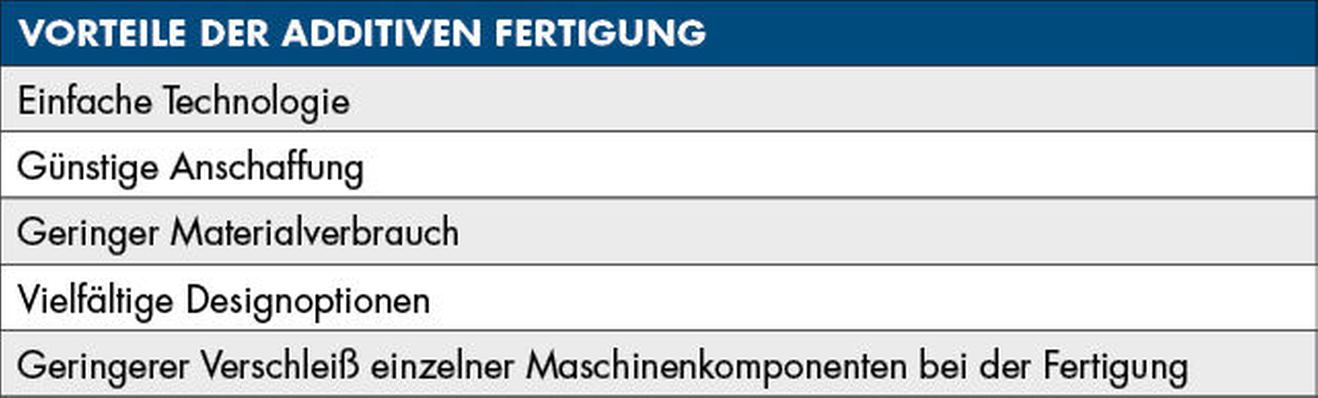 Bei den additiven Fertigungsverfahren lassen sich Materialschichtstärken zwischen 15 und 100 µm realisieren; auf diese Weise kann das Ausgangsmaterial sehr nachhaltig genutzt und eine hohe Genauigkeit erzielt werden. Der schichtweise Aufbau eines Objekts ermöglicht es, Multimaterialstrukturen mit anisotropen Eigenschaften (anisotrop = Stoffeigenschaft, die richtungsabhängig variiert), beispielsweise verschiedene Farben oder Werkstoffe, zu fertigen und damit an die benötigten Anforderungen individuell anzupassen [Yan et al., 2010]. Viele additive Fertigungsverfahren sind in technologischer Hinsicht einfach aufgebaut und somit in der Regel kostengünstig in der Anschaffung. Da Materialien additiv ohne hohen Kraftaufwand verbunden werden, ergibt sich nur ein geringer Verschleiß einzelner Maschinenkomponenten. Auch der Materialverlust ist im Vergleich zu subtraktiven Verfahren geringer. Mehrere verschiedene Objekte können zudem gleichzeitig hergestellt werden, wodurch eine wirtschaftliche und schnelle Fertigung möglich wird.