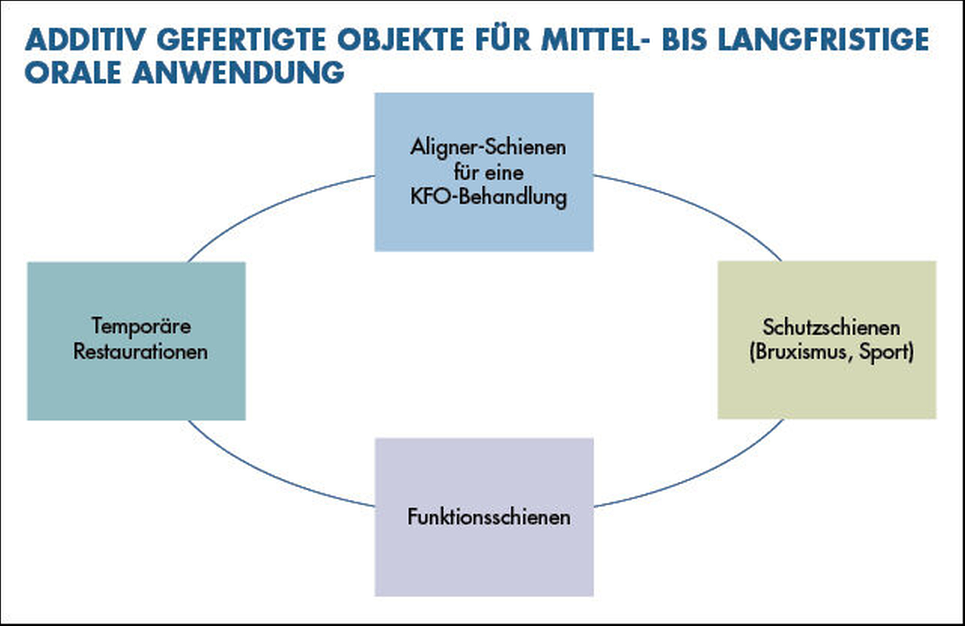 Für eine kurzzeitige orale Verweildauer eignet sich eine Vielzahl von additiv gefertigten Objekten (Abbildung 2). Mittel- bis langfristig klinisch anzuwendende additiv gefertigte Objekte sind in Abbildung 3 dargestellt. Einige additiv gefertigte Objekte eignen sich für den langfristigen permanenten klinischen Einsatz (Abbildung 4).