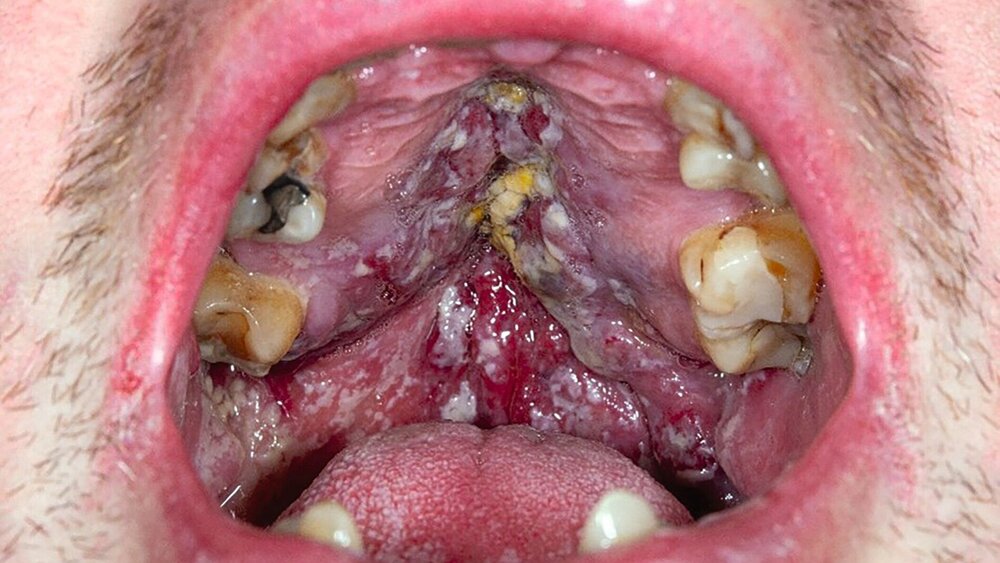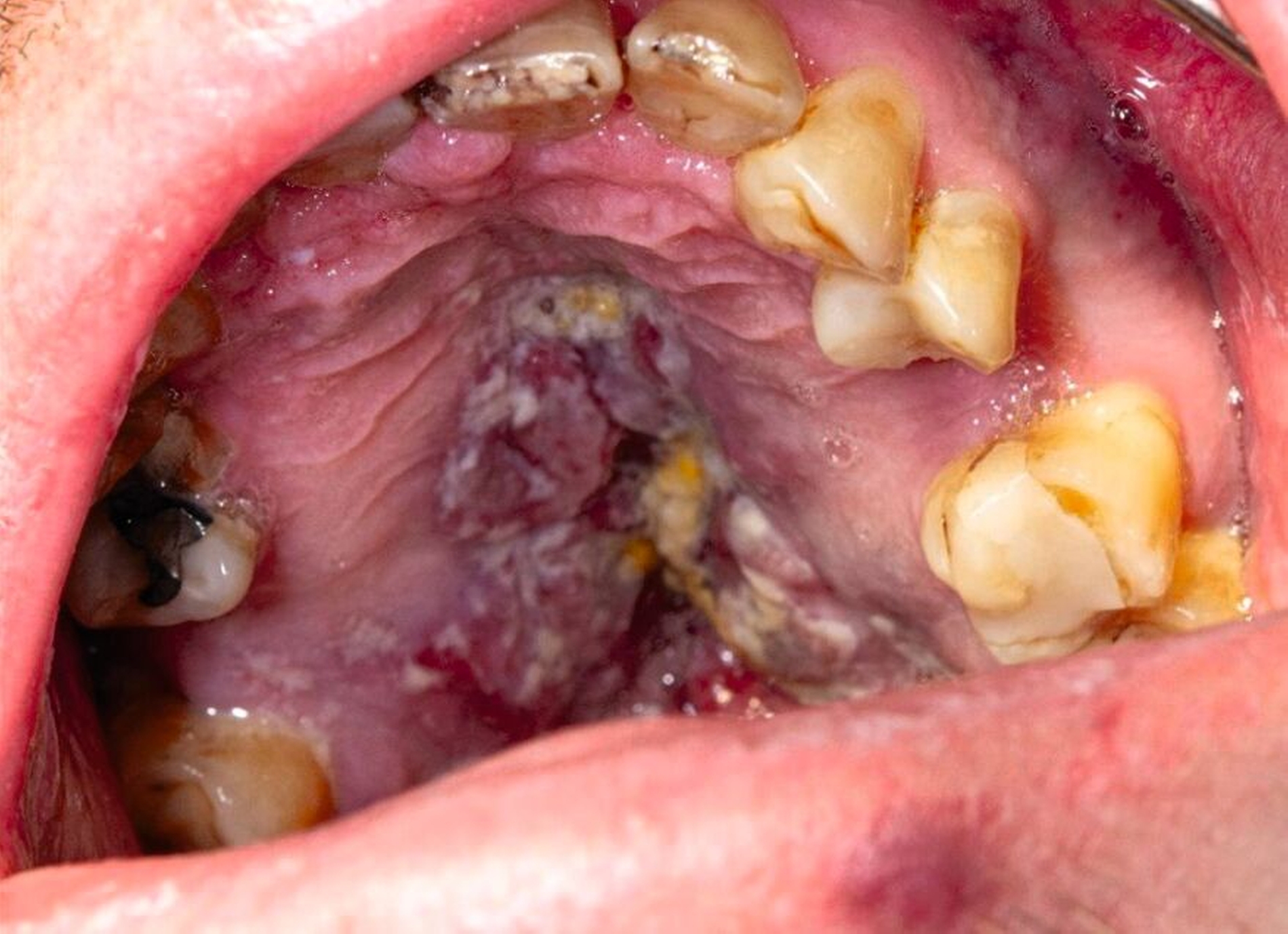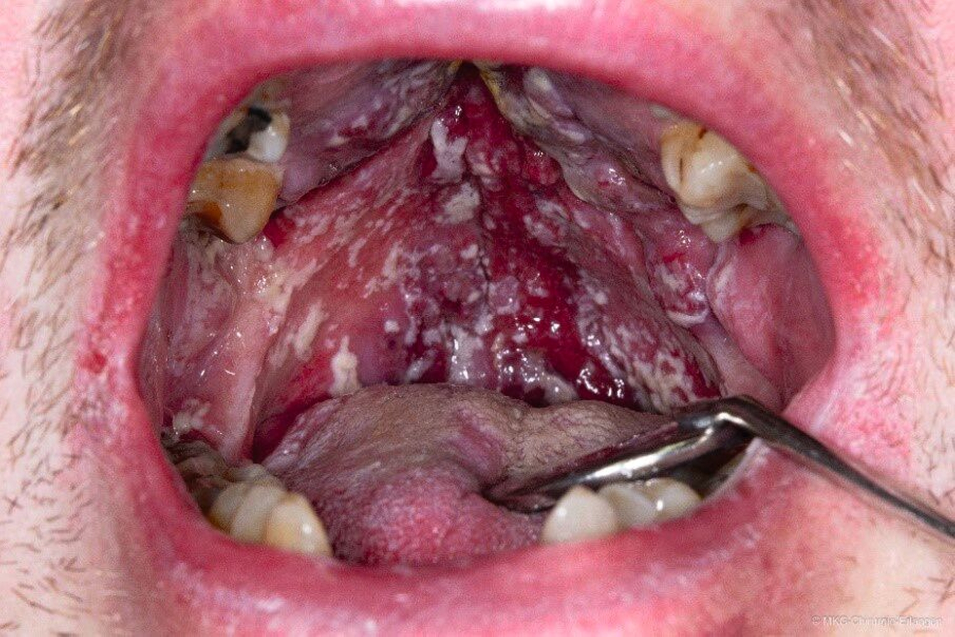 In der klinischen Untersuchung zeigten sich im Bereich des harten und des weichen Gaumens bläulich-livide Verdickungen der Schleimhaut mit einem flächigen Soorbefall, die auf Palpation schmerzhaft waren. Der Übergang in den Rachen war stark gerötet, die restliche Mundschleimhaut von Soor bedeckt. An der linken Unterlippe konnte man einen circa 0,5 cm x 0,5 cm großen bläulichen Knoten erkennen. Die Speicheldrüsenausgänge waren vergrößert und gerötet. Der Patient zeigte eine mäßige Mundhygiene bei einem konservierend versorgten teilbezahnten Gebiss.