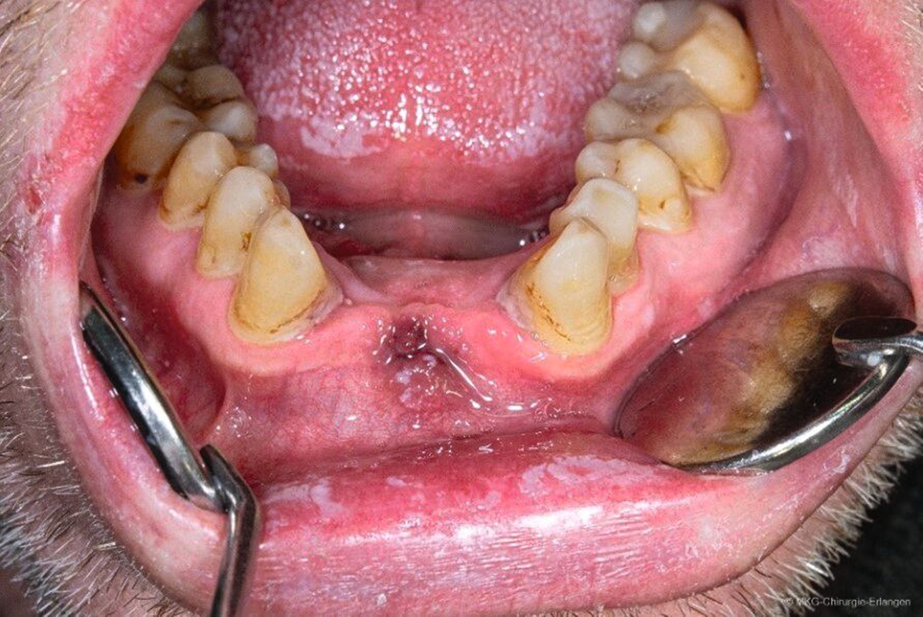 Ein 58-jähriger Patient in reduziertem Ernährungszustand stellte sich nach Überweisung durch seinen Hauszahnarzt in der Hochschulambulanz der Mund-, Kiefer- und Gesichtschirurgischen Klinik des Uniklinikums Erlangen vor.