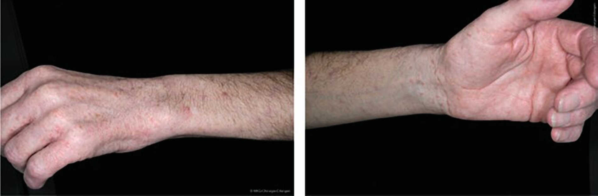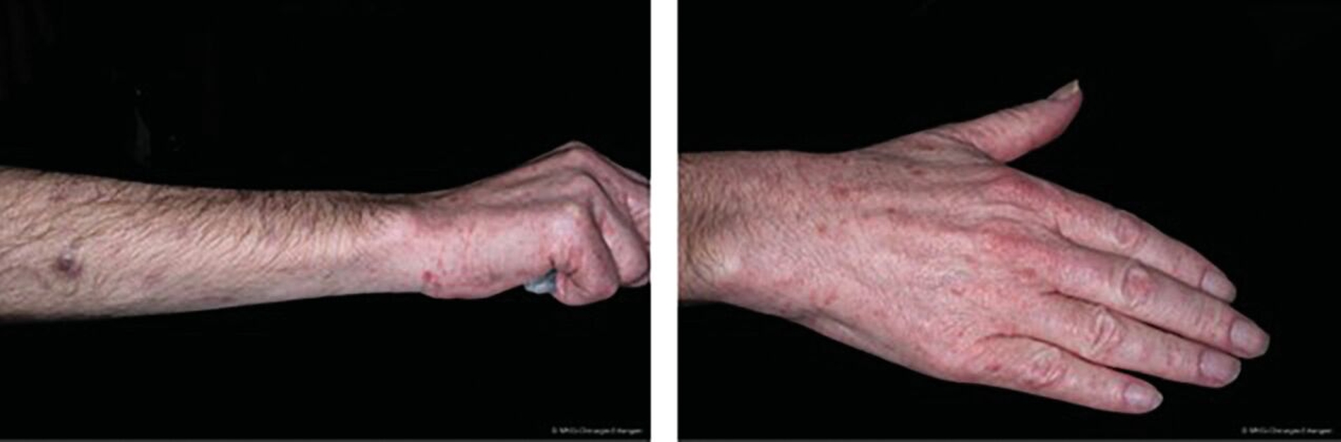 Anamnestisch bestanden zu diesem Zeitpunkt keine Vorerkrankungen, weder nahm er dauerhaft Medikamente ein noch bestand ein Risiko hinsichtlich eines Nikotin- oder Alkoholabusus. Ebenso wenig waren bei der Erstvorstellung Allergien oder Unverträglichkeiten bekannt. Der Mann berichtete jedoch über eine seit mehreren Wochen bestehende Schwellung am Gaumen. Außerdem habe er einen immer stärker werdenden Hustenreiz. Während der eingehenden Anamneseerhebung erzählte er von seit mehreren Monaten auftretenden Ausschlägen an Armen und Händen, die sich bis dato therapieresistent zeigten. Eine Immundefizienz oder Immunsuppression verneinte der Patient.