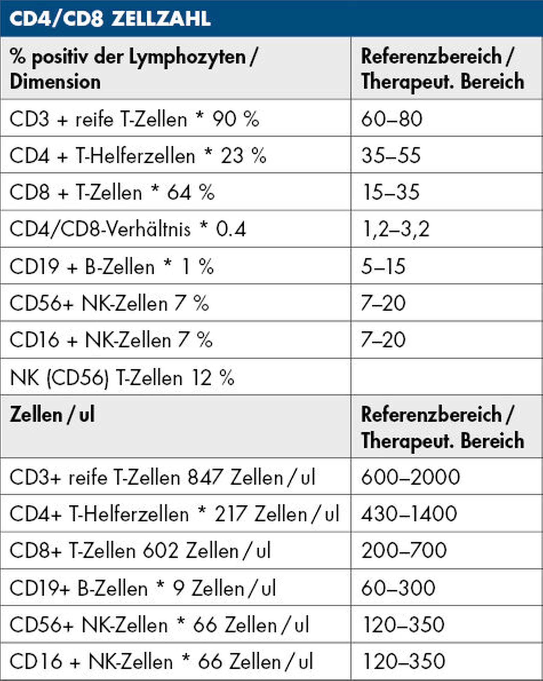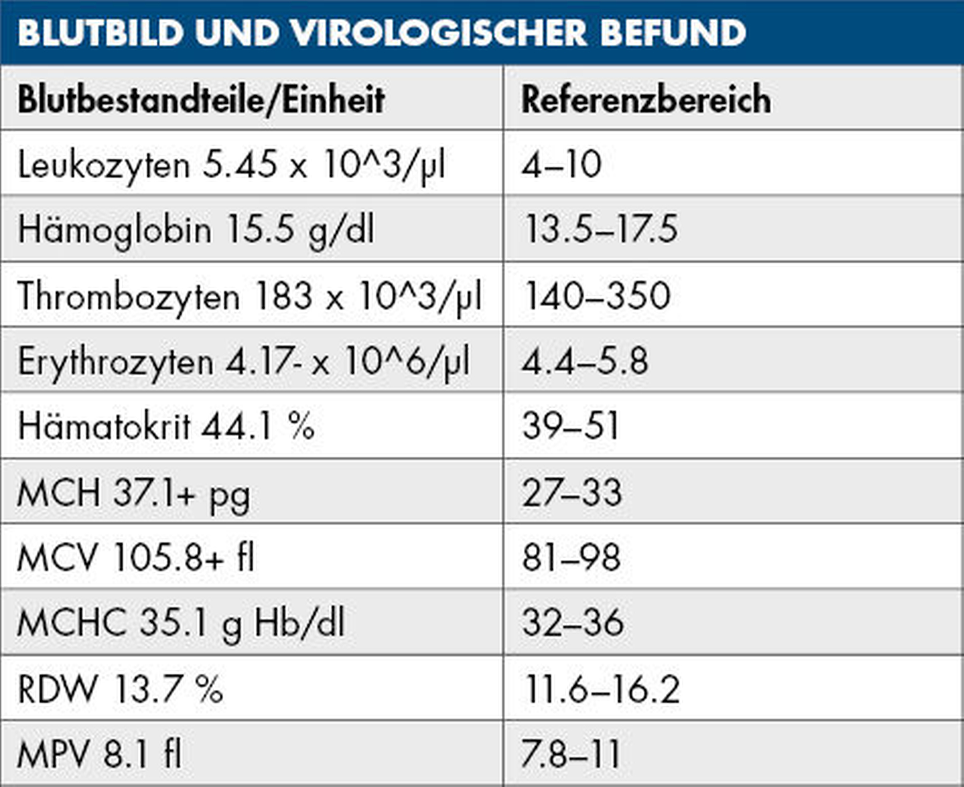 In der angefertigten Panoramaschichtaufnahme ergab sich hinsichtlich der Schwellung am Gaumen kein morphologisches Korrelat und kein dentogener Fokus. Durch das klinische Erscheinungsbild der extra- und der intraoralen Befunde wurden nach detaillierter Aufklärung des Patienten ein ausführliches Blutbild erstellt und eine virologische Diagnostik durchgeführt. In der Zusammenschau ergaben sich folgende Befunde: