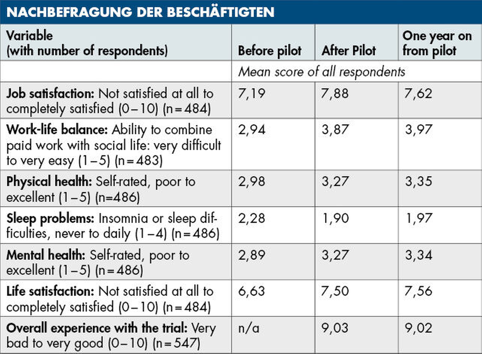 Eine parallel stattfindende Neubefragung der Beschäftigten zeigte ebenfalls zahlreiche langanhaltende Effekte. Die Mitarbeitenden arbeiteten im Mittel nur noch 33,1 Wochenstunden und berichteten sowohl von einer gestiegenen Jobzufriedenheit als auch von positiven Auswirkungen auf ihre Gesundheit (Tabelle).