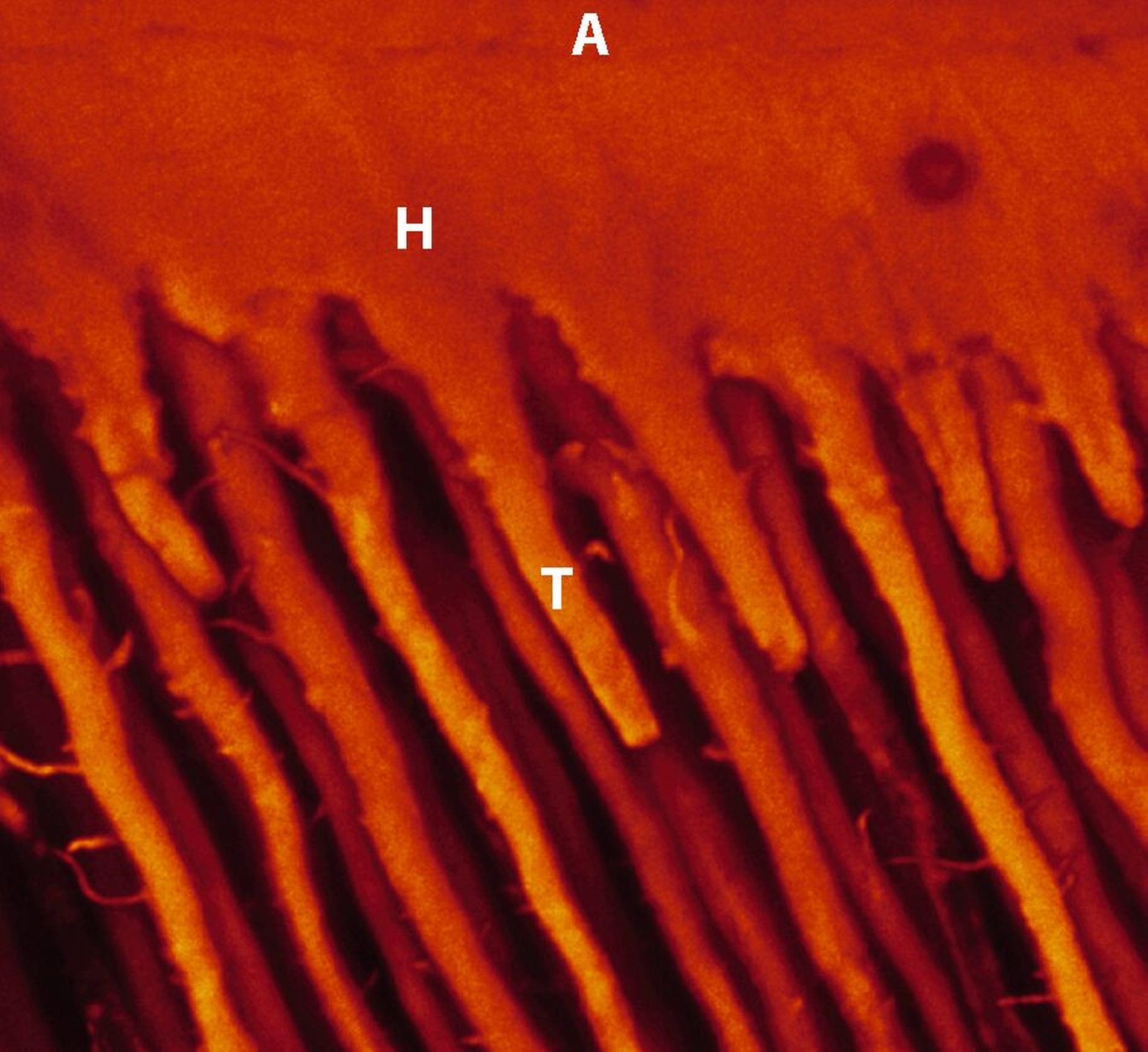 Eine besondere Situation stellt die Caries profunda dar. Hier gibt es hinreichend Evidenz, dass unterhalb einer Restdentindicke von 300 μm zum einen die Gefahr besteht, dass kurzkettige Monomere das Dentin durchdringen und Biomineralisationsprozesse der Odontoblasten stören können [Galler et al., 2011; Schmalz et al., 2001]. Praktisch viel wichtiger ist jedoch ein rein geometrisches Problem: Bondet man eine Kompositrestauration im Dentin so nahe an der Pulpa, bilden sich neben der für die Dentinhaftung verantwortlichen Hybridschicht auch Harzzotten (Resin Tags), die bis zu 300 μm in das Dentin eindringen (Abbildung 2). Das würde bedeuten, dass sich die Tags praktisch am Eingang der Pulpa befinden, was weder klinisch noch anatomisch sinnvoll erscheint. Gleiches gilt für pulpanahe Bereiche bei Kronenfrakturen. Insbesondere bei Kindern sind die Dentintubuli noch weit offen und das Dentin ist an diesen Stellen hoch permeabel [Krastl et al., 2021].