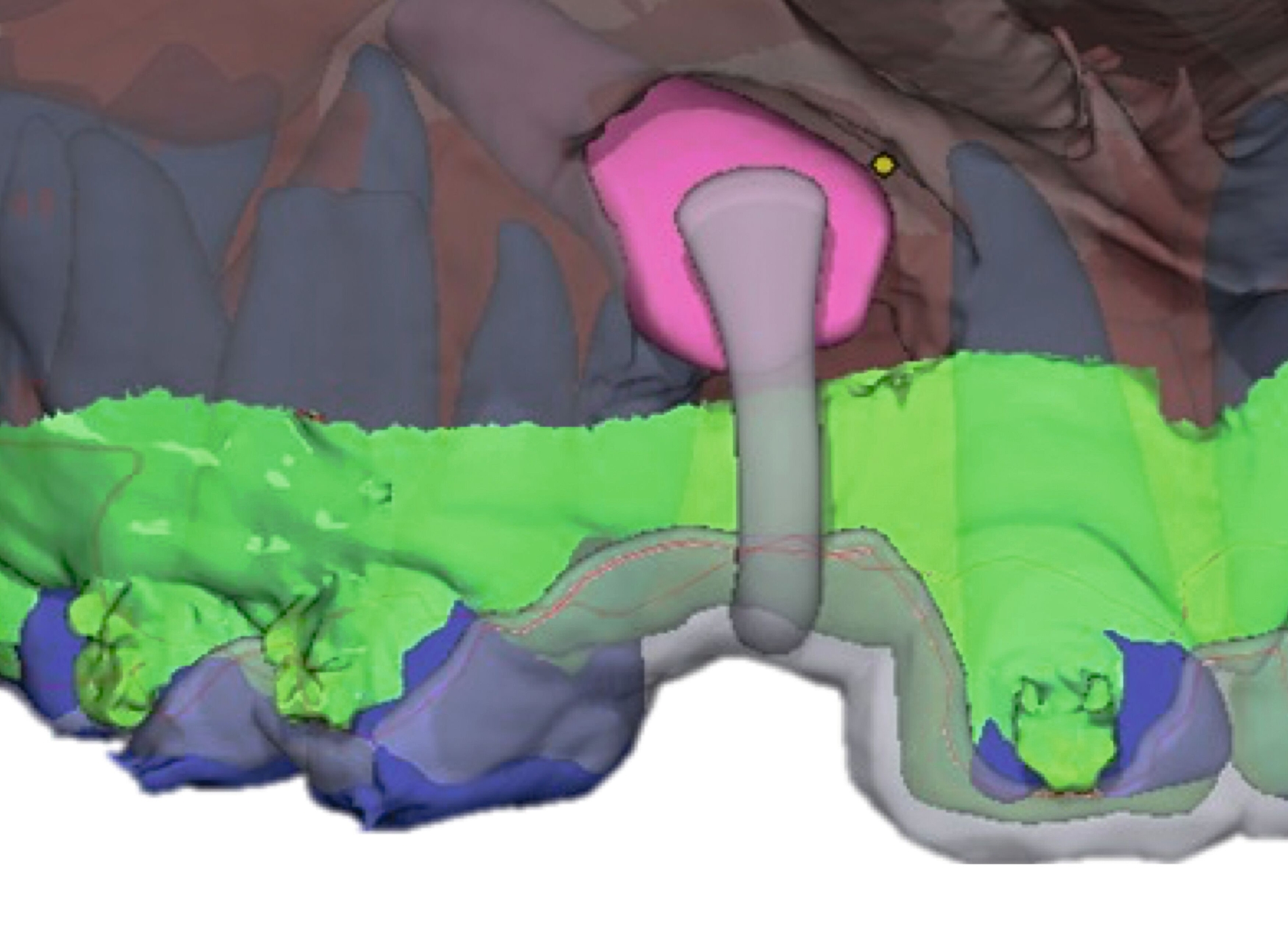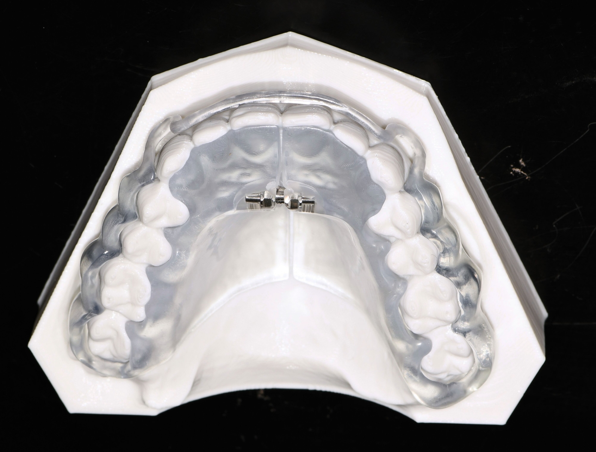 Weiter erlauben hochindividuelle 3-D-gedruckte Designs die Therapie von skelettalen Fehlständen, beispielsweise in der Therapie defizitärer Maxillae [Pasqua et al., 2022; Bazargani et al., 2023; Ludwig et al., 2024] oder im Rahmen der nonoperativen oder postoperativen Prognathie-Behandlung [Hodecker et al., 2023]. Auch die Umsetzung skelettal verankerter Apparaturen mittels nichtmetallischer 3-D-Druckmaterialien findet in einzelnen Fällen Anwendung (Abbildung 3b). Zum Einbringen der Miniimplantate eignen sich sogenannte 3-D-gedruckte „Insertions-Guides“, die nach vorheriger digitaler Planung der Miniimplantat-Position, eine hochgenaue Insertion ermöglichen [Wilmes et al., 2022; Wilmes et al., 2022]. Die virtuelle Planung der Minischraubeninsertion ermöglicht eine sichere und nachvollziehbare Evaluation sämtlicher relevanter Gewebe, um die ohnehin geringen Risiken weiter zu minimieren. Zusätzlich kann man die Biomechanik der digital geplanten kieferorthopädischen Apparatur ideal koordinieren und – wenn man möchte – die Minischrauben und die Apparatur in einer Sitzung einsetzen.