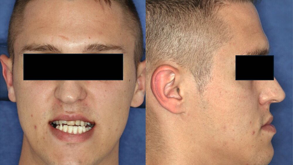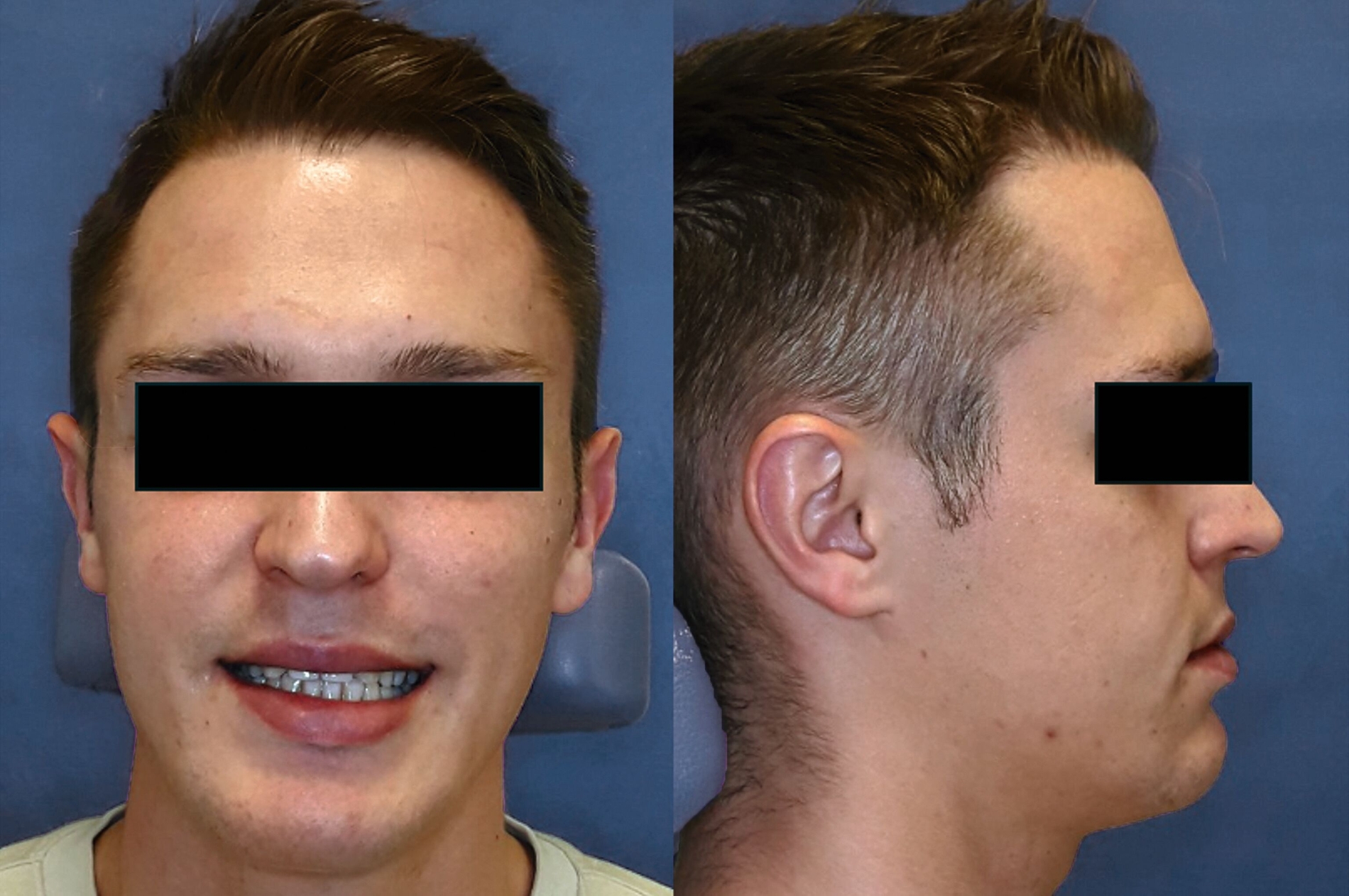 Ein 25-jähriger Patient stellte sich mit dem Wunsch nach Optimierung seines Erscheinungsbildes und seiner Kaufunktion in der kieferorthopädischen Praxis vor (Abbildung 1). Klinisch zeigten sich eine Angle-Klasse-III-Verzahnung mit einer 3/4 Prämolarenbreite Mesialokklusion beidseits und ein zirkulärer Kreuzbiss von 18–12/48–41 und 21–28/31–37. Es lagen ein negativer Overjet von -6,7 mm und ein Overbite von 5,1 mm vor. Eine Mittellinienverschiebung wurde sowohl im Oberkiefer – mit einer Abweichung von 4 mm nach rechts – als auch im Unterkiefer – mit einer Abweichung von 3 mm nach links – diagnostiziert (Abbildungen 2 und 3).