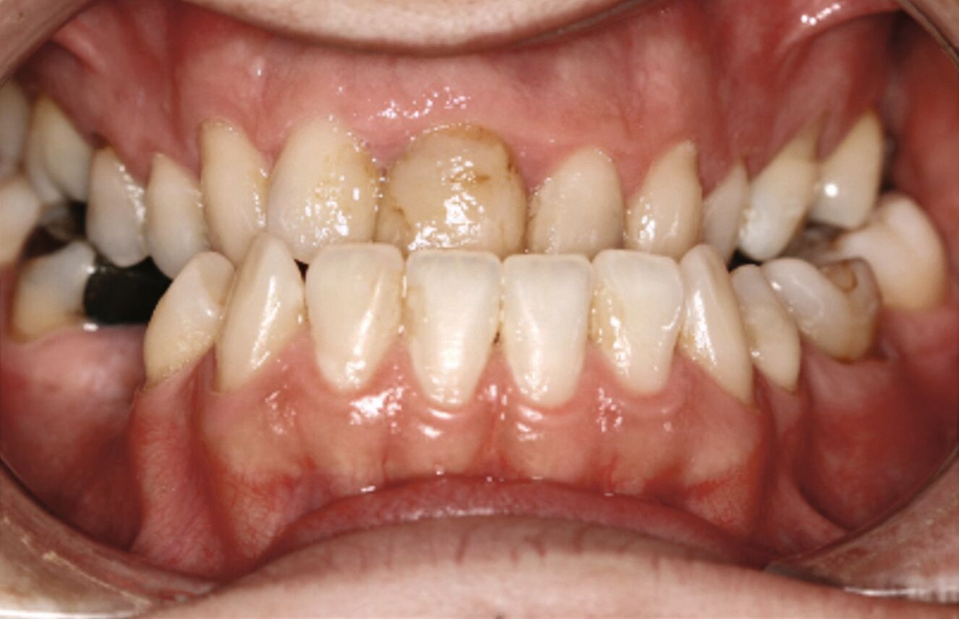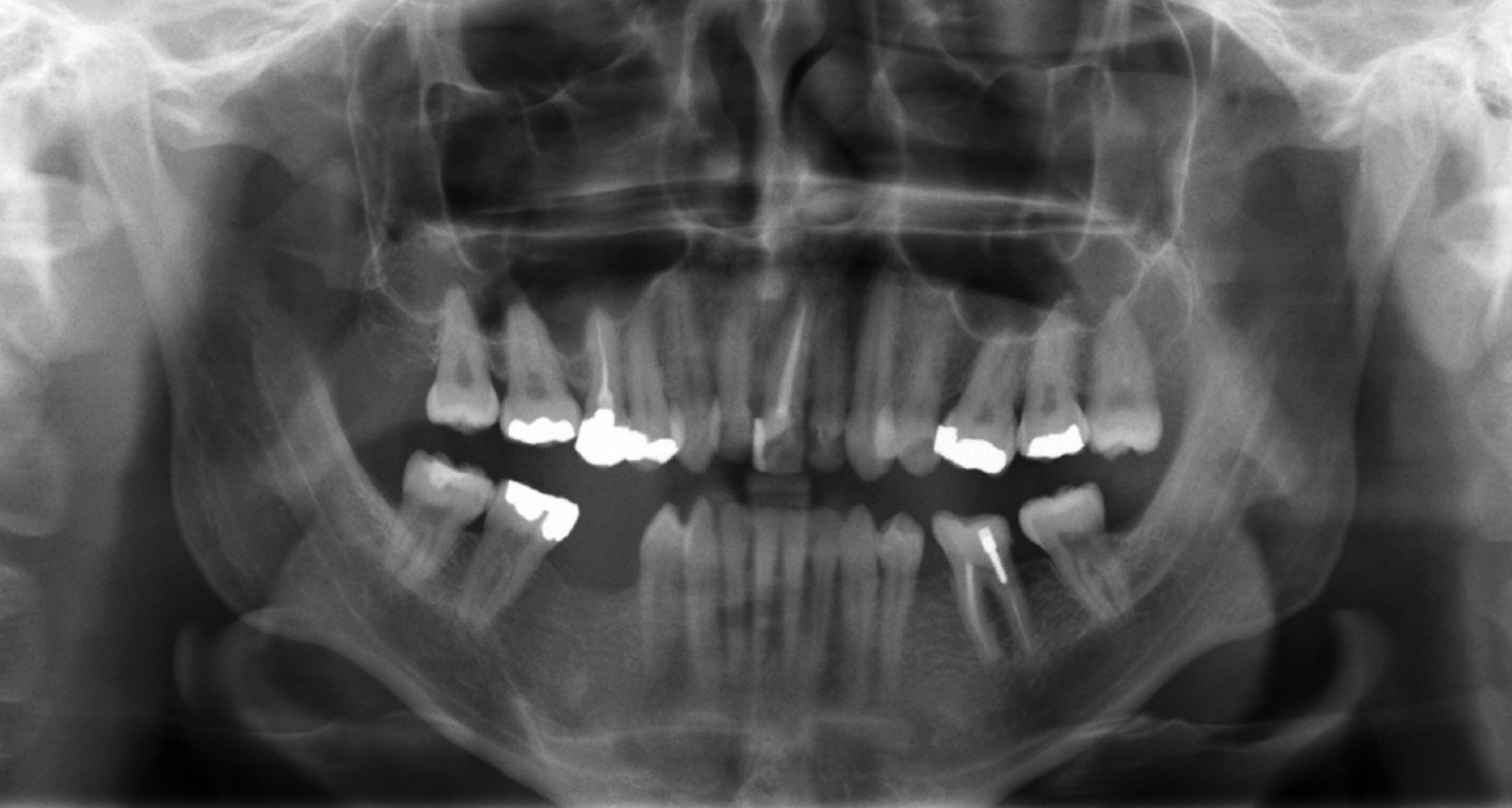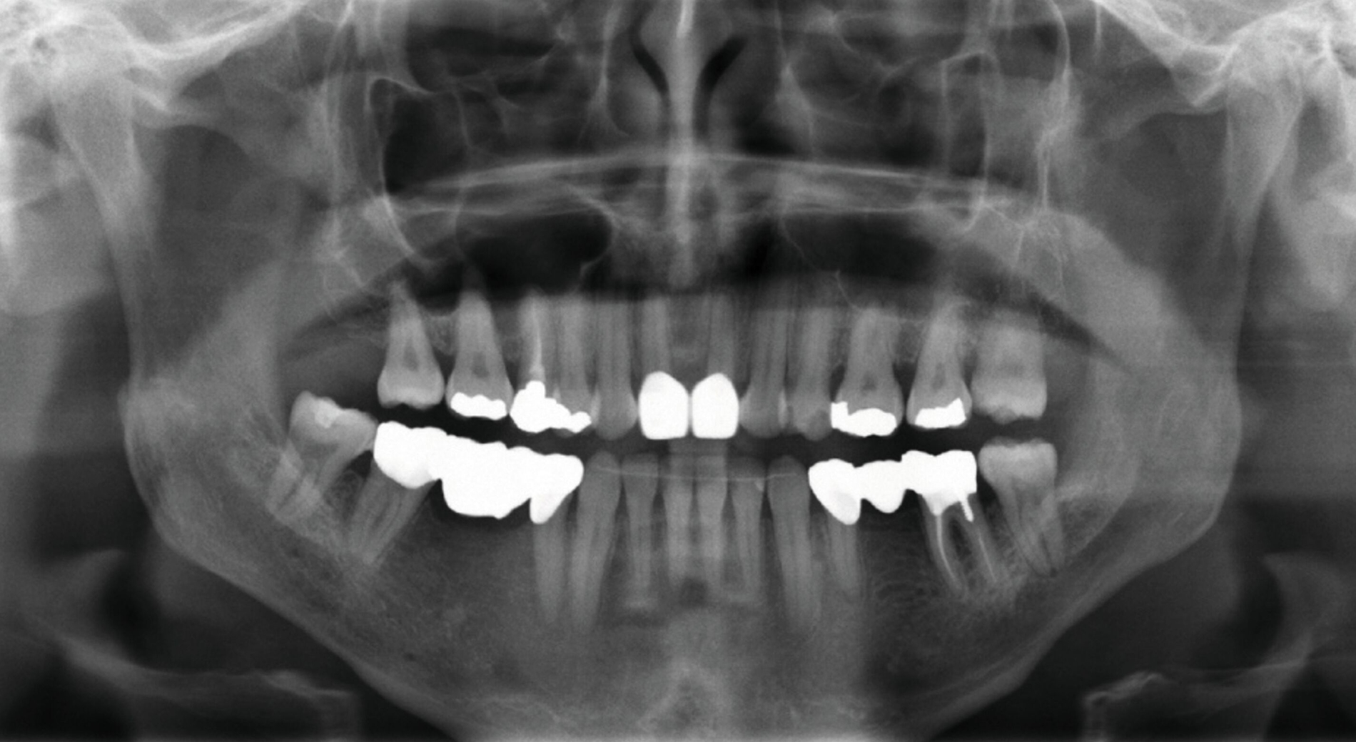 Aufgrund einer hohen Kariesanfälligkeit und einer klinisch floriden Parodontitis waren bereits mehrere Zähne des Patienten extrahiert worden, darunter 16, 11, 25, 38, 35, 45 und 46. Die mesiale Kippung und Aufwanderung der angrenzenden Zähne ließ vermuten, dass der Zahnverlust zeitlich weiter zurücklag. Aufgrund der reduzierten Langzeitprognose des Zahnes 11 entschieden wir uns gemeinsam mit dem Patienten für eine Ausgleichsextraktion des Frontzahns.