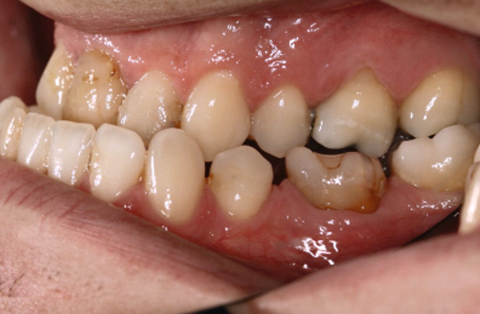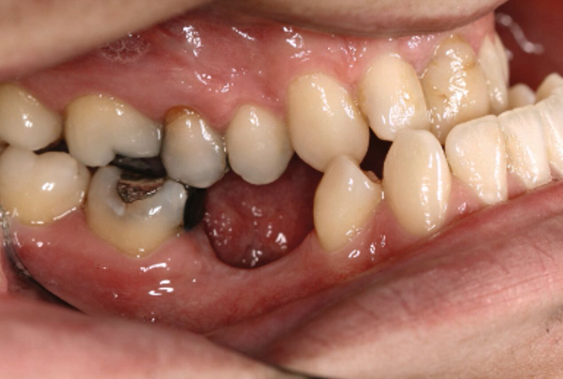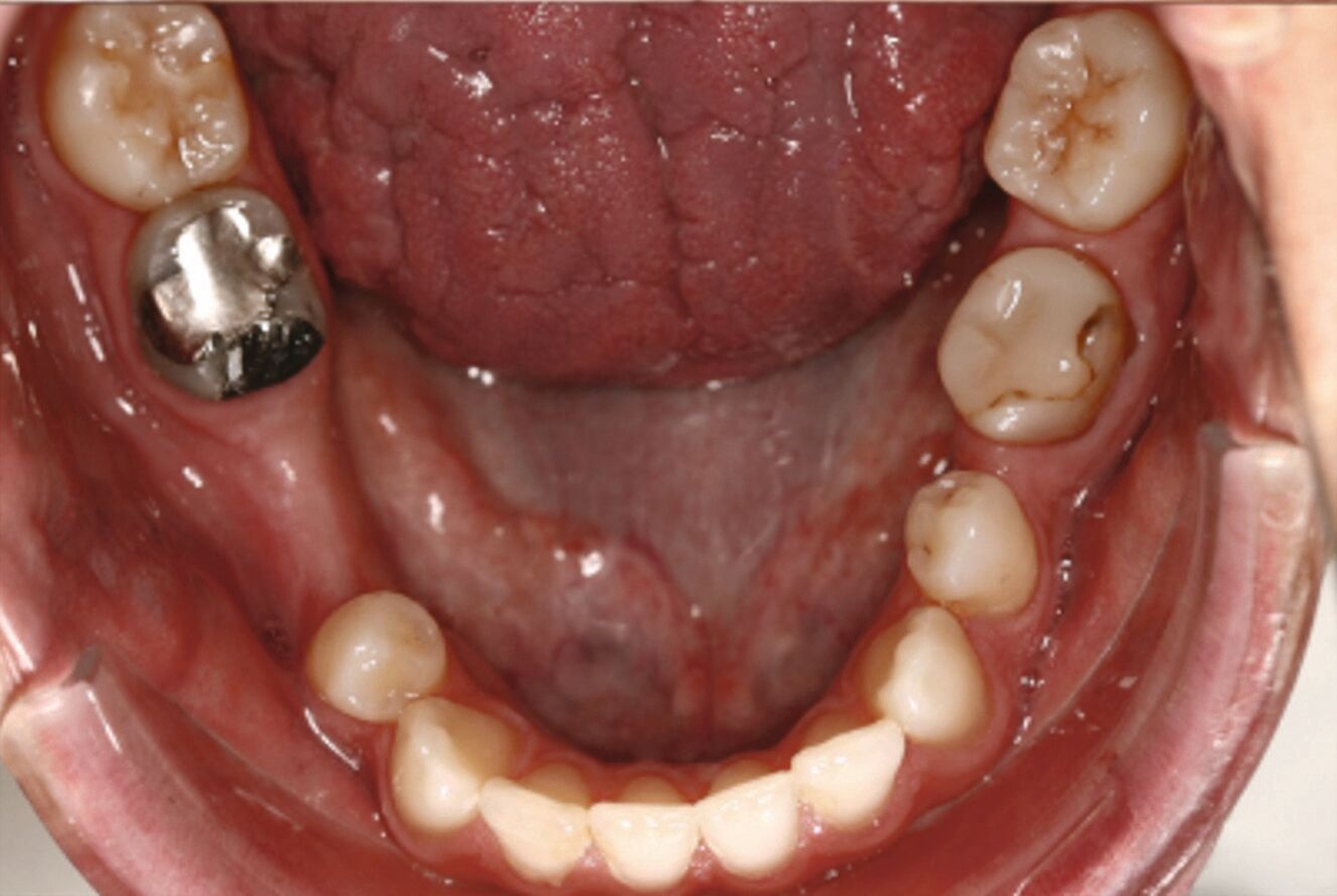 Aufgrund einer hohen Kariesanfälligkeit und einer klinisch floriden Parodontitis waren bereits mehrere Zähne des Patienten extrahiert worden, darunter 16, 11, 25, 38, 35, 45 und 46. Die mesiale Kippung und Aufwanderung der angrenzenden Zähne ließ vermuten, dass der Zahnverlust zeitlich weiter zurücklag. Aufgrund der reduzierten Langzeitprognose des Zahnes 11 entschieden wir uns gemeinsam mit dem Patienten für eine Ausgleichsextraktion des Frontzahns.