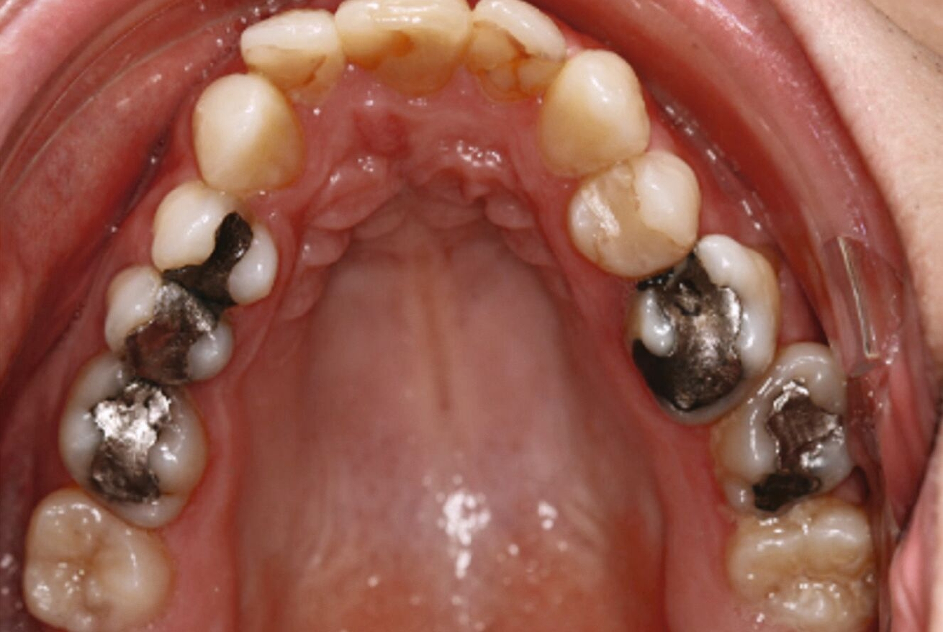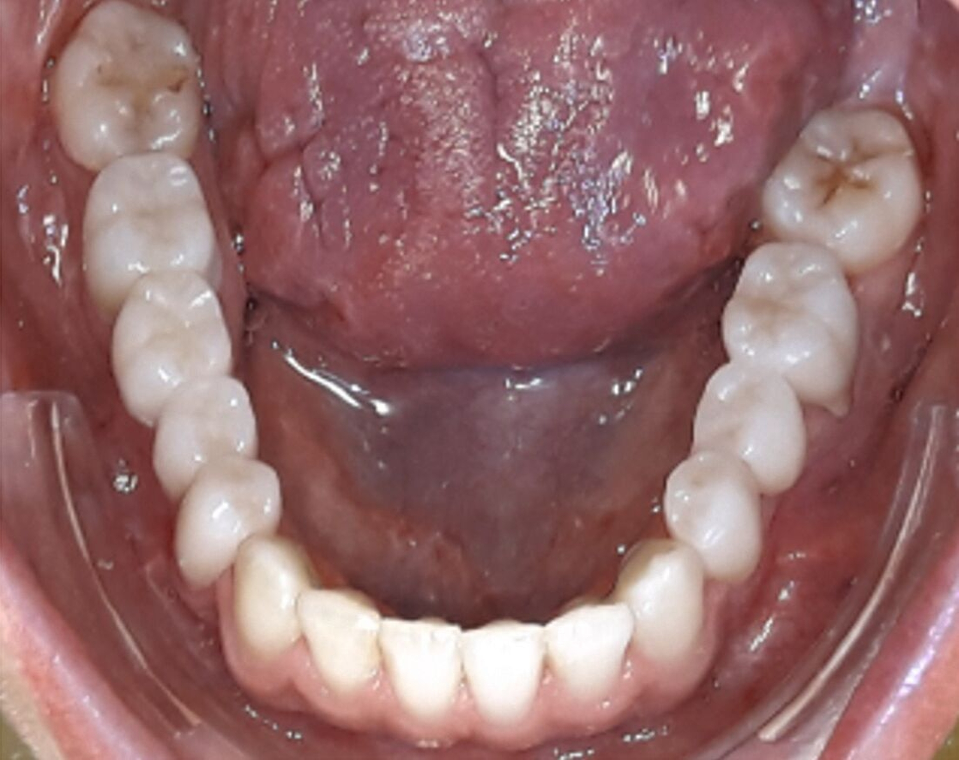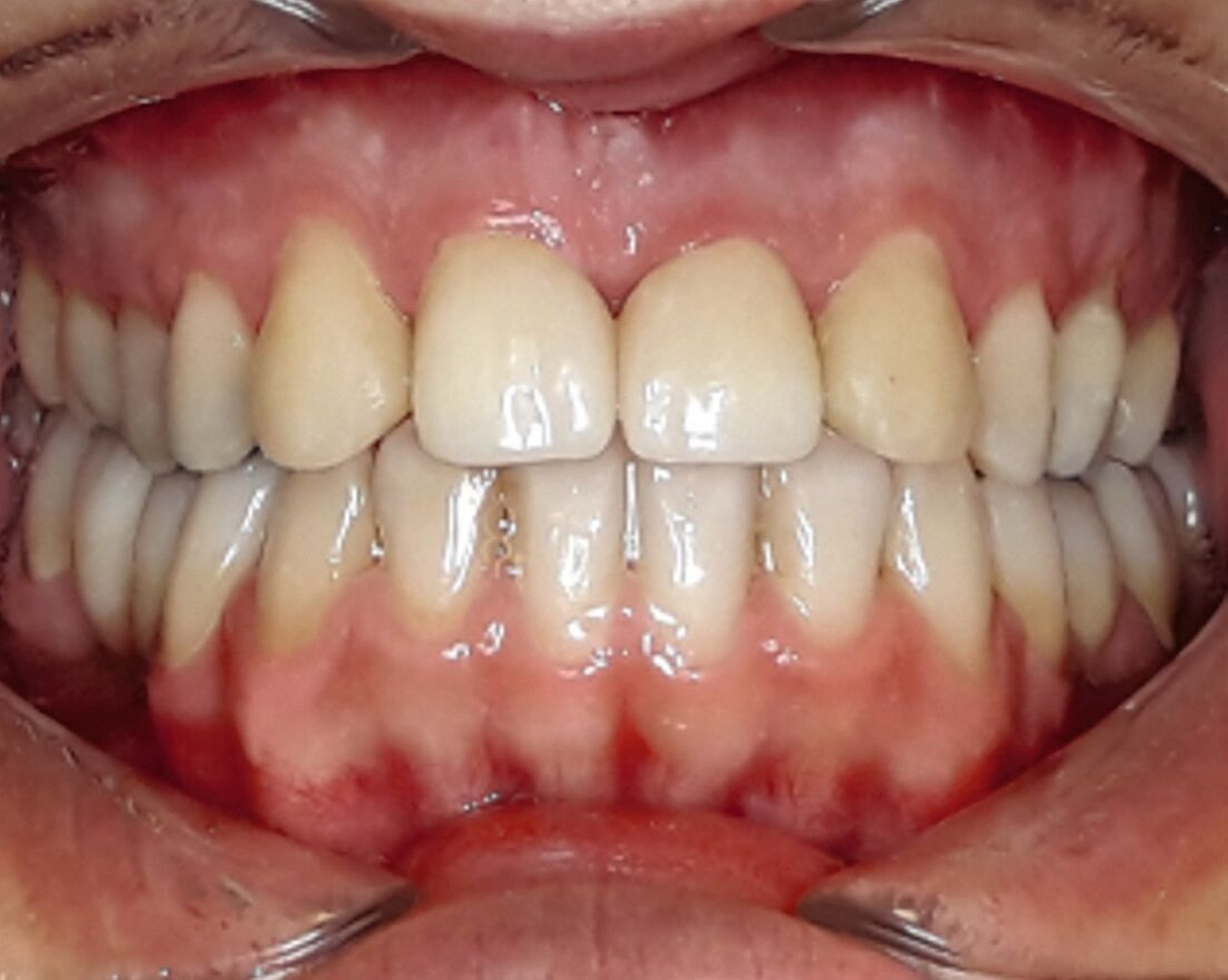 Der Hauszahnarzt versorgte die Zähne 12 und 22 mithilfe eines zuvor erstellten Wax-ups jeweils mit CAD/CAM-hergestellten Einzelkronen. Die Schaltlücken im Unterkiefer wurden mit Brücken geschlossen. Abschließend wurden im Unterkiefer ein festsitzender Retainer (33–43) eingesetzt und in beiden Kiefern zusätzlich Miniplastschienen zur Retention verwendet (Abbildungen 5 bis 7).
