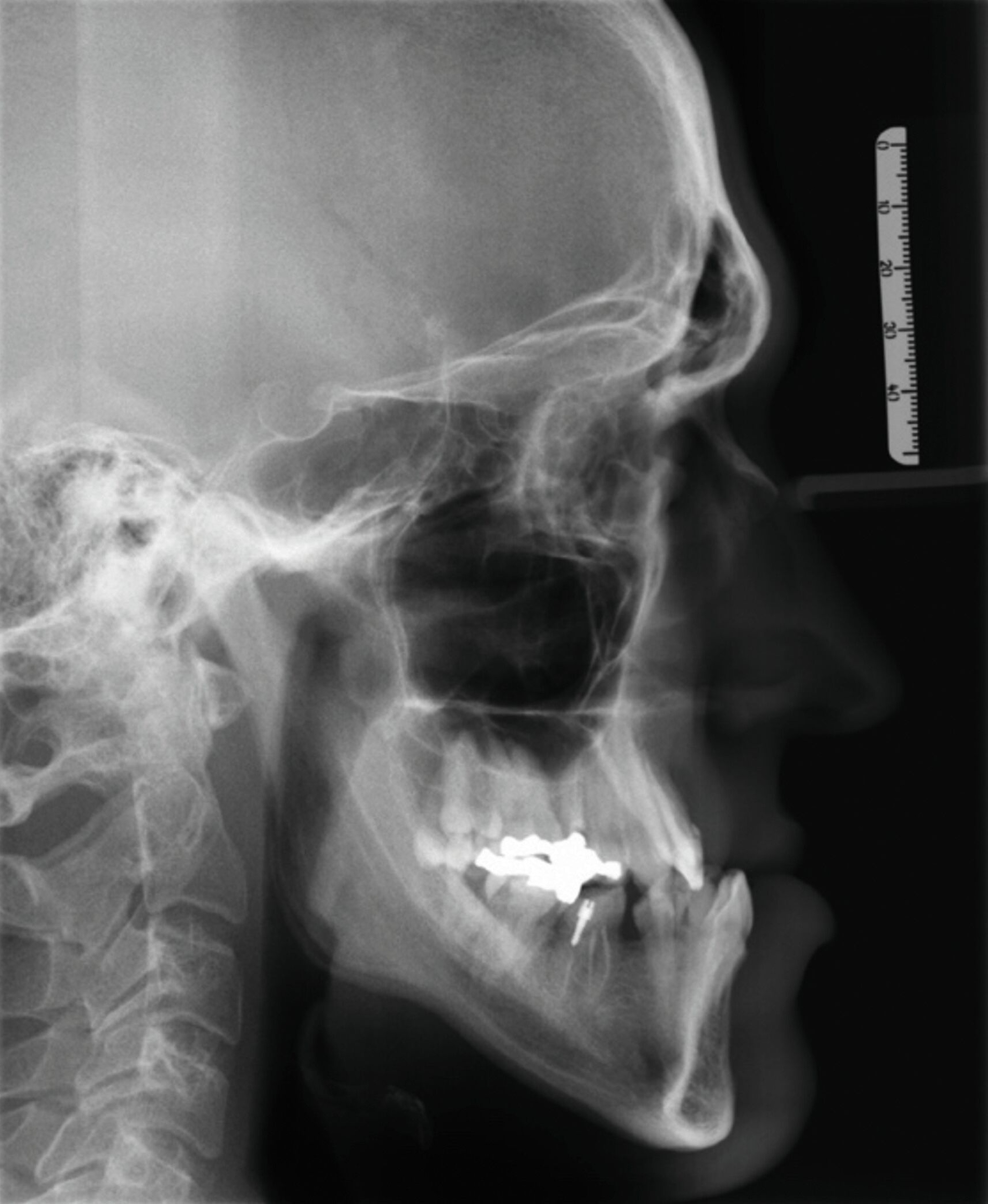 Die Auswertung der Fernröntgenseitenaufnahme ergab eine orthognathe Maxilla (SNA: 80,7°) und eine prognathe Mandibula (SNB: 90°) bei Vorliegen eines dolichofazialen Wachstumsmusters (Abbildung 4). Zudem deuteten die Ergebnisse auf eine mesiale basale Diskrepanz hin (ANB: -9,2° und WITS: -8,2 mm). Die Oberkieferfrontzähne zeigten eine orthoaxiale Stellung, während die Unterkieferfrontzähne einen ausgeprägten lingualen Kippstand aufwiesen. Die kephalometrischen und die klinischen Befunde deuteten somit auf ein Long-Face-Syndrom hin.