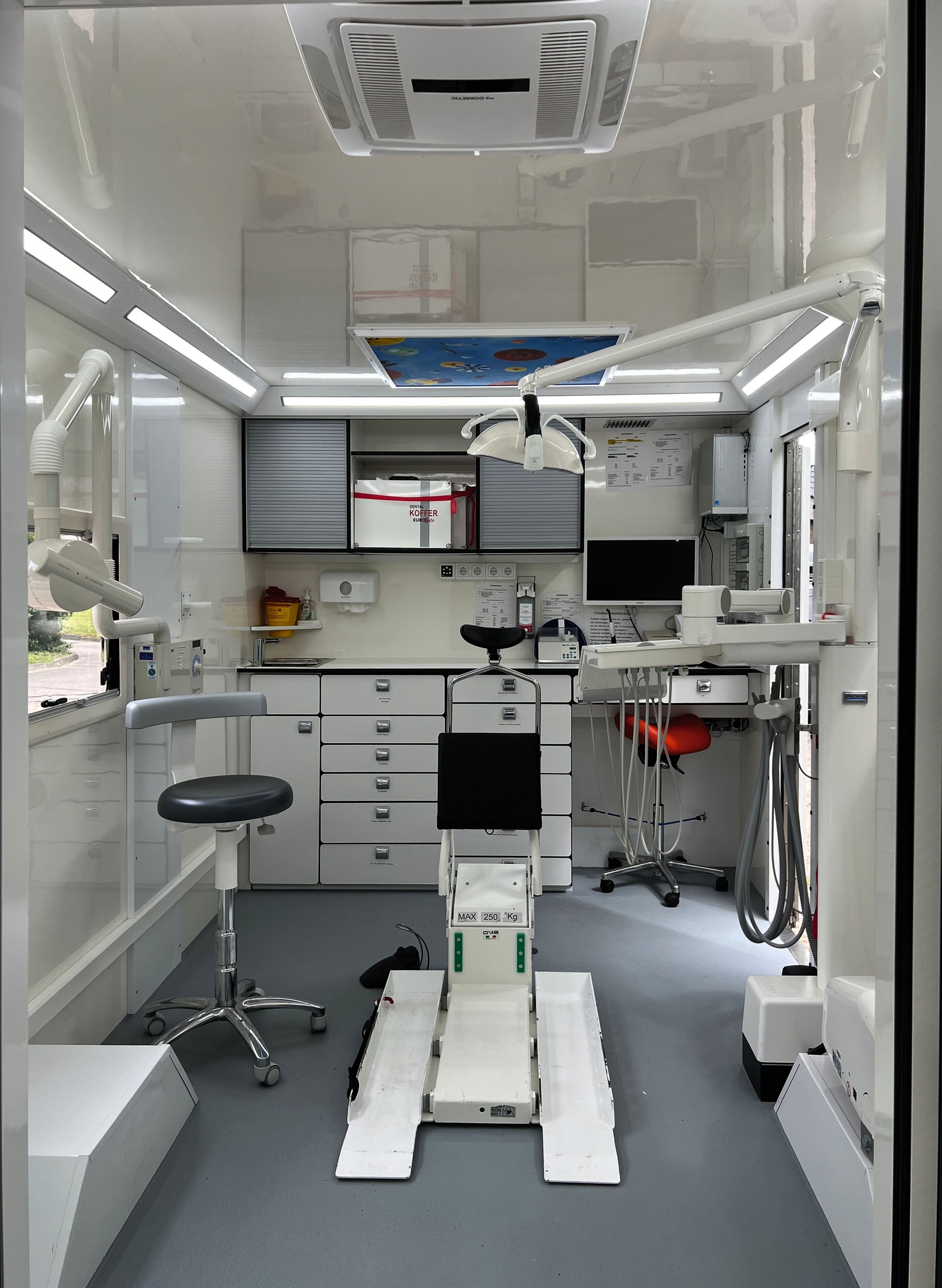 Eine Bewohnerin des Alten- und Pflegeheims „Haus am Bodden“ in Ribnitz-Damgarten geht – gestützt auf ihren Krückstock – auf das auf dem Hof stehende Spezialfahrzeug zu. An der Rampe für Rollstühle angekommen, beäugt sie neugierig das Innere. Was sich dem Auge der alten Dame hier bietet, ist kein normaler Bus, sondern eine voll ausgestattete mobile Zahnarztpraxis. Mit digitalem Röntgengerät und einer Rollstuhlaufnahme, die fest im Boden fixiert ist und eine sichere Positionierung der Patienten gewährleistet, mit einem Gewicht von 3,5 Tonnen.