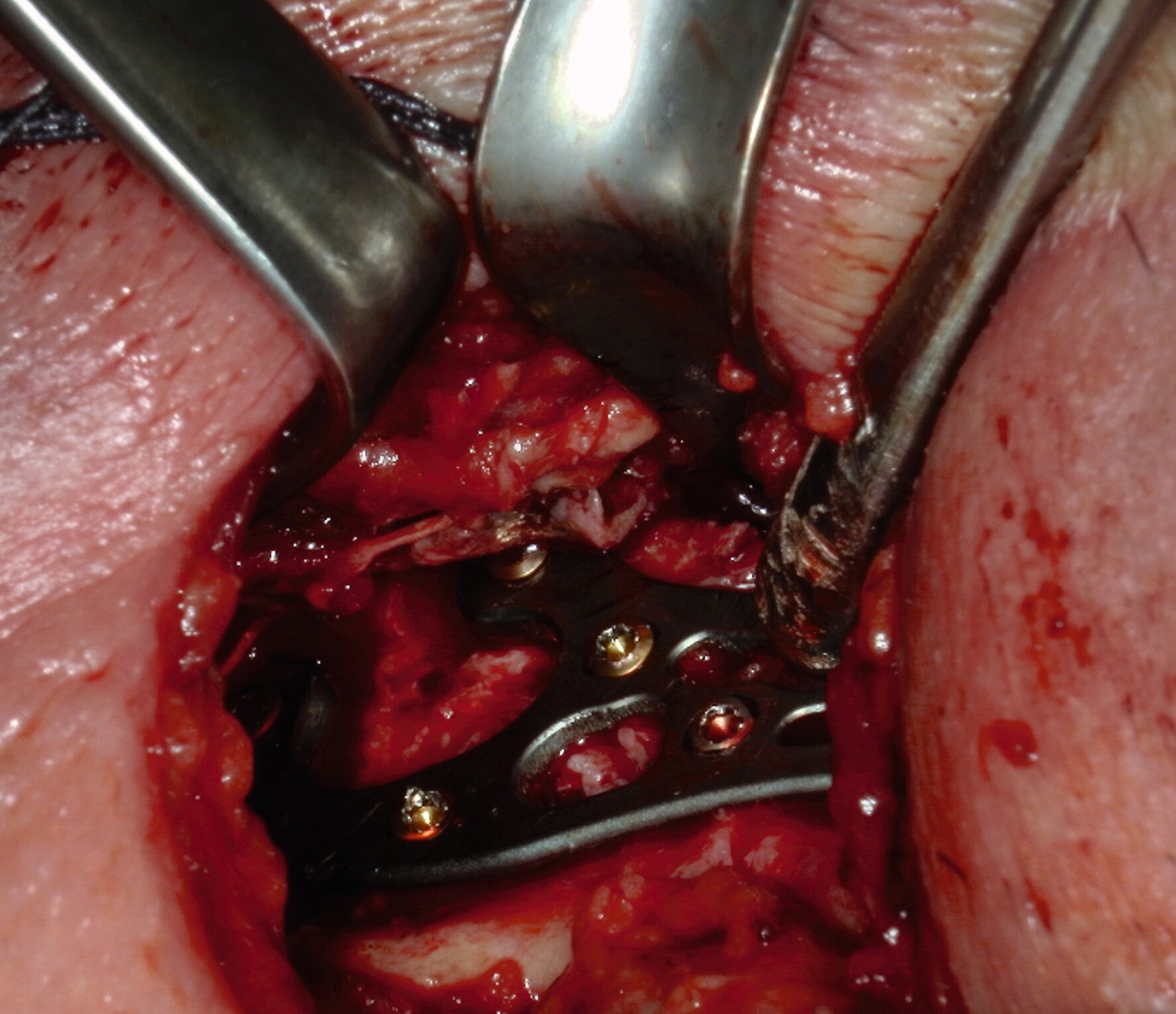 Intraoperativ wurde die Kontinuitätsresektion des Unterkiefers gemäß der präoperativen Planung vom Kieferwinkel bis knapp unterhalb der Incisura semilunaris über einen rein extraoralen Zugang durchgeführt, wobei der Nervus alveolaris inferior dargestellt und geschont wurde. Entscheidend war in diesem Fall, dass es zu keinem Zeitpunkt zu einer Eröffnung des Operationssitus nach enoral kam, wodurch eine Kontamination des avaskulären Knochens durch Speichel oder Speisereste vollständig vermieden werden konnte. Unsere klinische Erfahrung zeigt, dass eine solche Perforation, ebenso wie die Notwendigkeit einer Hautinsel, eine mikrovaskuläre Rekonstruktion dringend erforderlich gemacht hätte.
