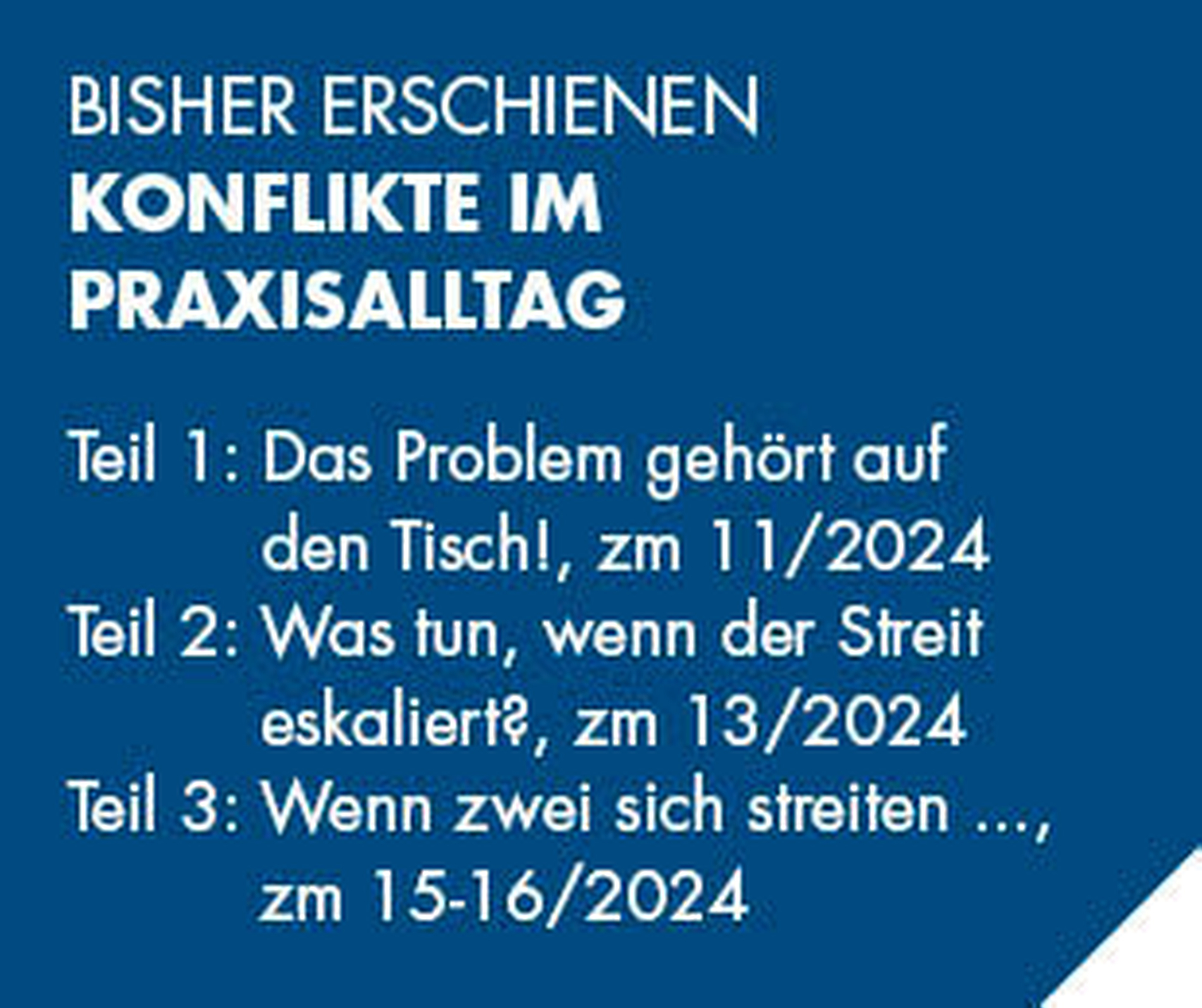 Je geringer die Eskalation, je kleiner beziehungsweise einfacher das Thema und je weniger man selbst als Chef involviert ist, desto wahrscheinlicher kann man den Konflikt zügig beilegen. Werfen wir einen Blick auf exemplarische Konfliktsituationen und mögliche Lösungsansätze: