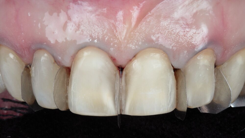 Um eine möglichst gleichmäßige Schichtstärke der späteren Veneers zu erhalten, erfolgte die Präparation der Zähne 13 bis 23 virtuell durch einen labialen Abtrag von 0,24 mm. Die späteren Veneers sollten 0,2 mm dick sein, zusätzlich wurden 0,04 mm für das Befestigungskomposit eingeplant. Mithilfe eines eines Multifarben-Polyjet-3-D-Druckers wurde daraus ein patientennahes Modell erstellt.
